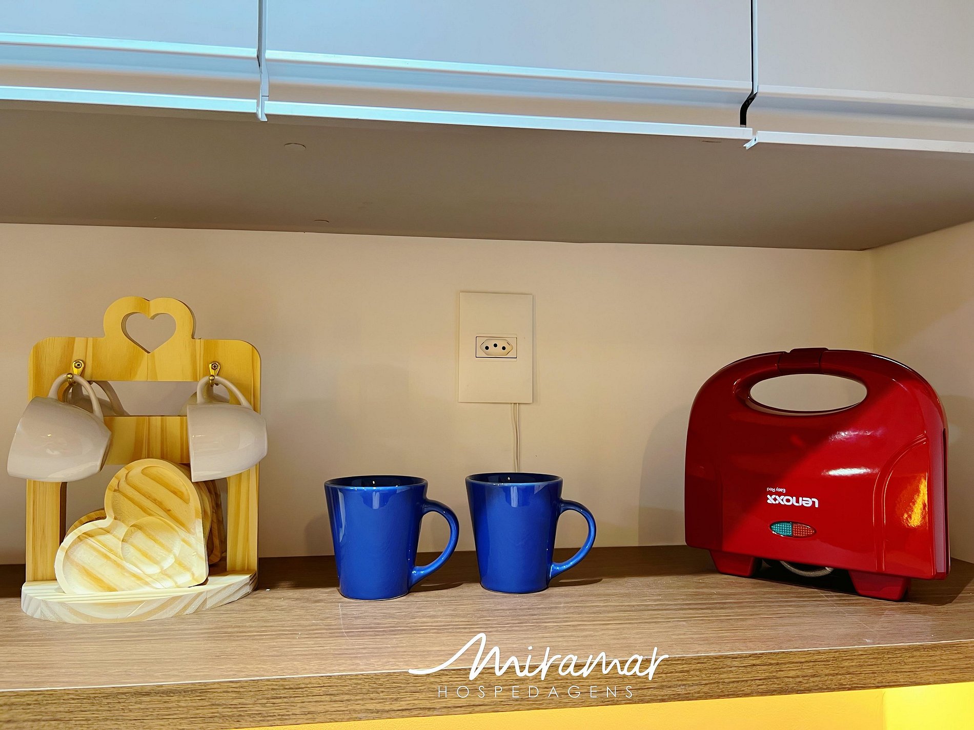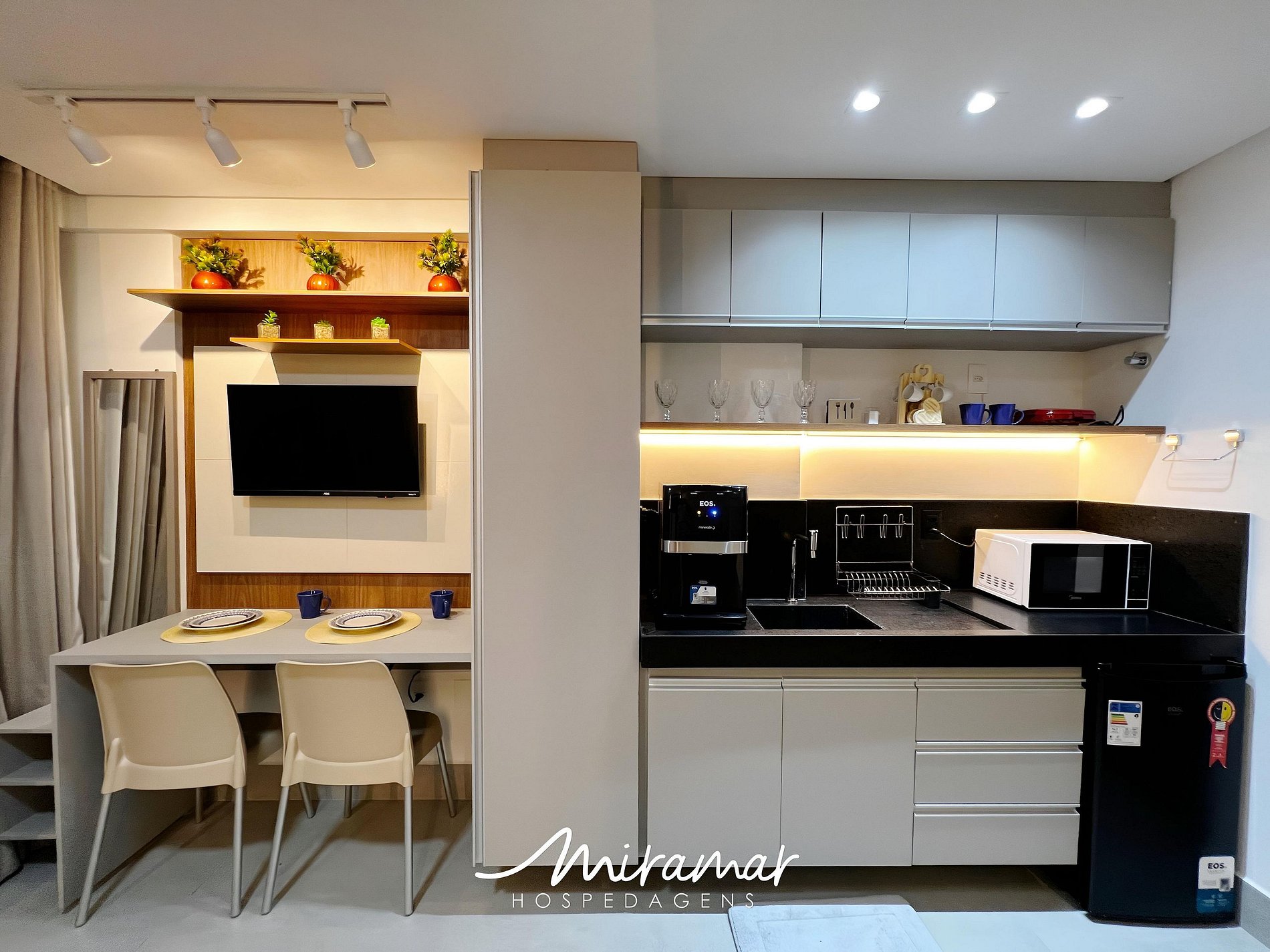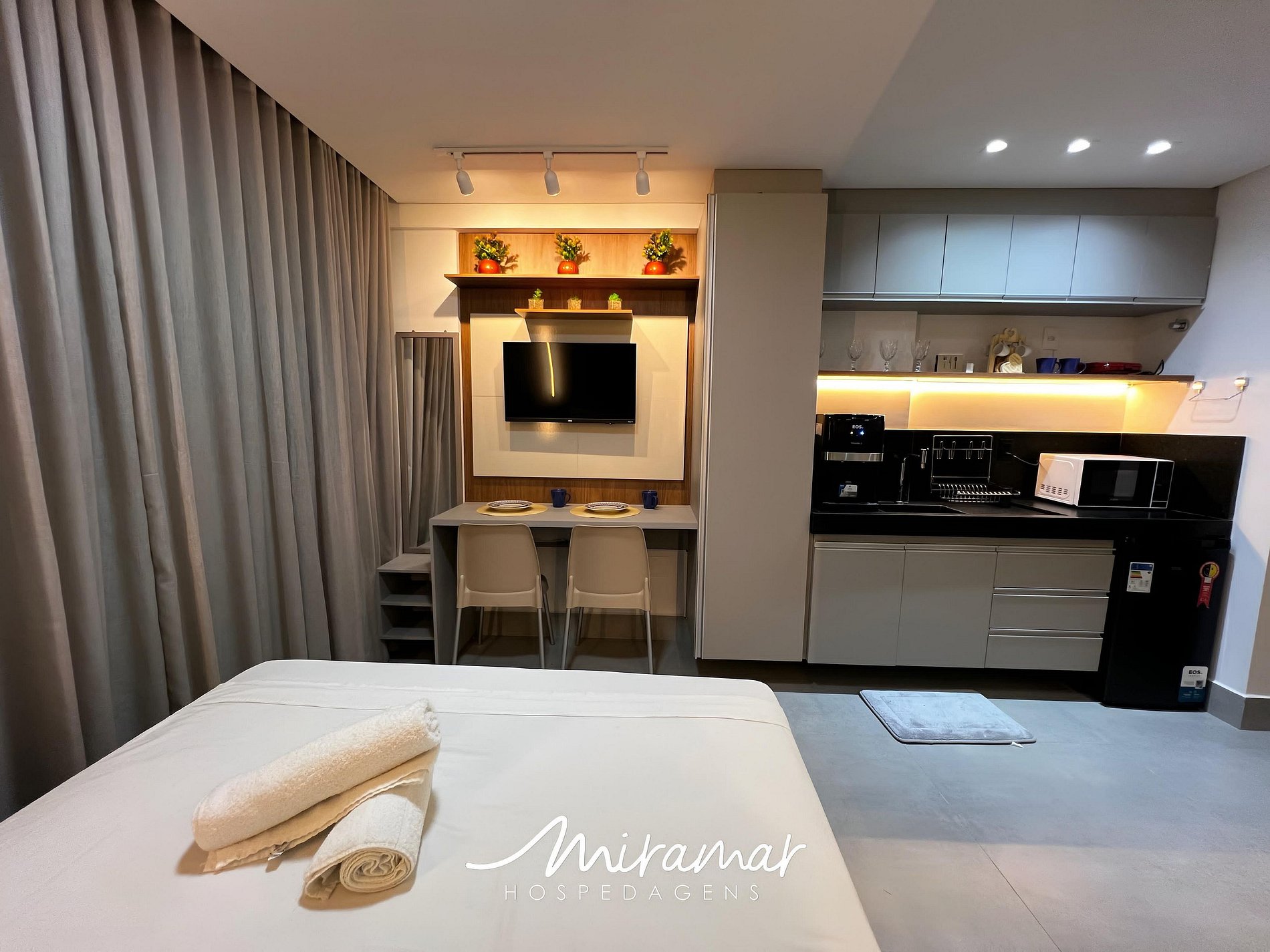A cozinha, moderna e bem equipada, dispõe de eletrodomésticos como frigobar, micro-ondas, cafeteira, liquidificador, sanduicheira e purificador de água, tornando o preparo de refeições rápidas e práticas ainda mais fáceis. Além disso, oferecemos um enxoval de cama e banho, com lençóis e toalhas para que sua estadia seja ainda mais confortável e agradável..