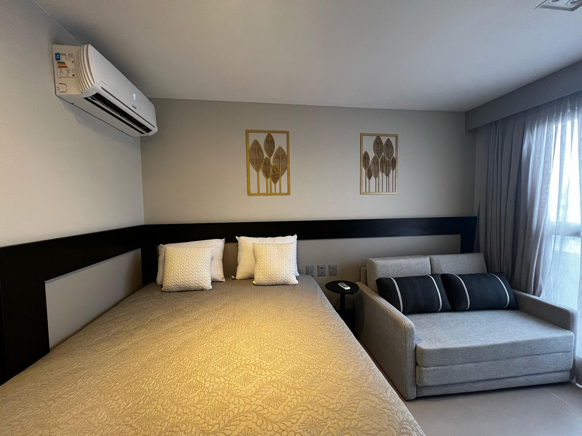 É com grande prazer que convidamos você a se hospedar neste espaço cuidadosamente planejado para oferecer o máximo de bem-estar e comodidade. Totalmente equipado, ele acomoda até 4 hóspedes com conforto, proporcionando uma estadia tranquila e agradável com vista lateral mar. O quarto dispõe de ar-condicionado, internet e TV, além de uma cama de casal e um sofá cama casal, ideais para momentos de descanso e relaxamento, além disso, uma mesa com duas cadeiras que proporciona o ambiente ideal para trabalhar ou desfrutar de suas refeições com praticidade.