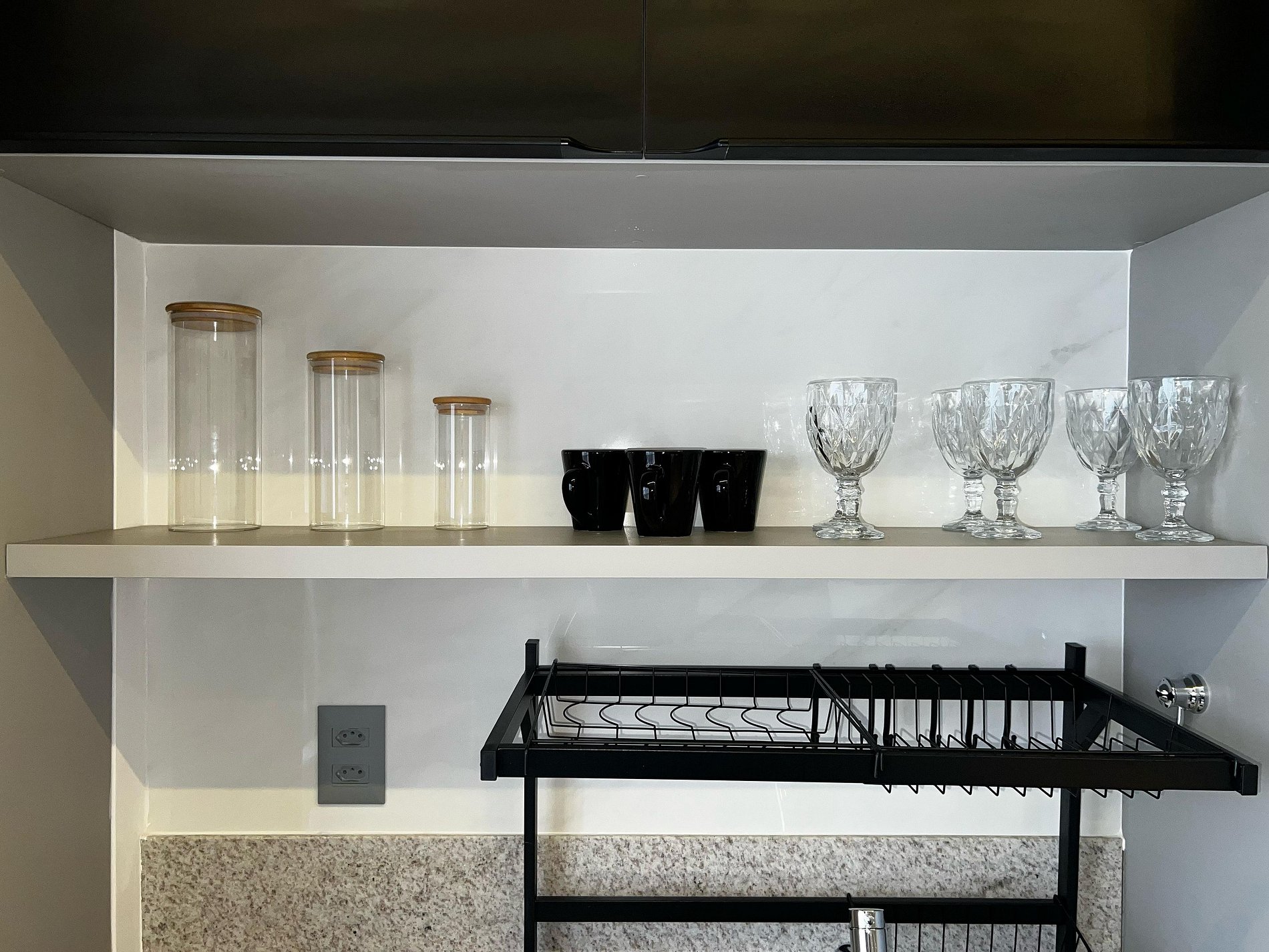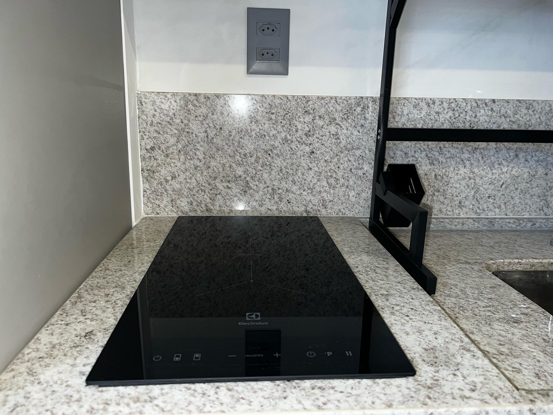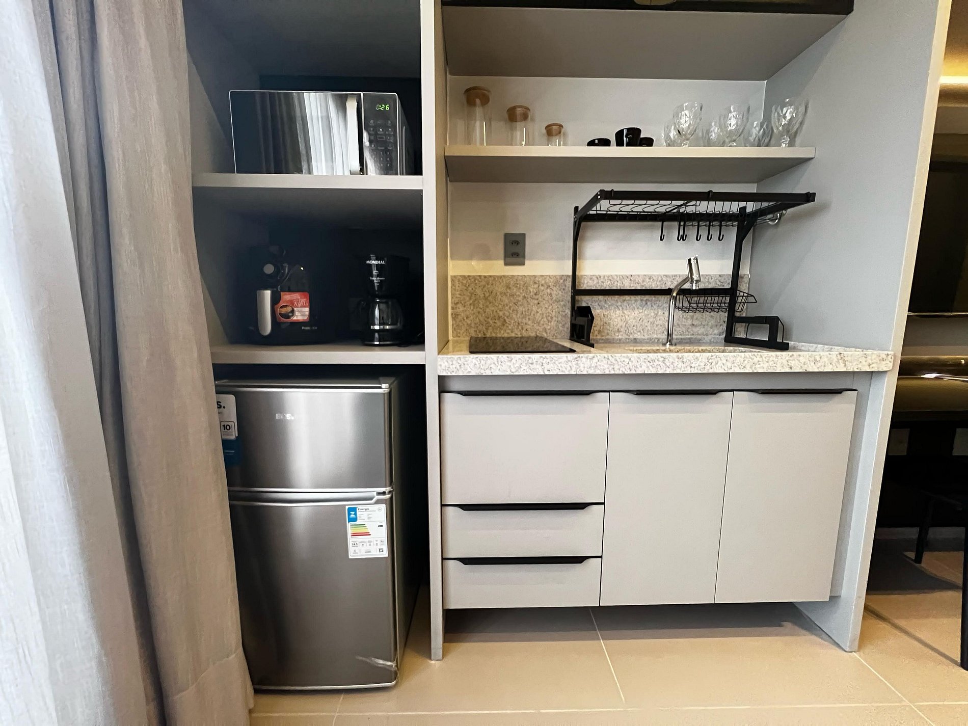 A cozinha foi planejada para oferecer máxima praticidade e está equipada com todos os eletrodomésticos essenciais: fogão, frigobar, micro-ondas, airfryer, liquidificador, cafeteira e sanduicheira. Além disso, você encontrará louças e talheres, garantindo tudo o que precisa para preparar suas refeições com facilidade e estilo.