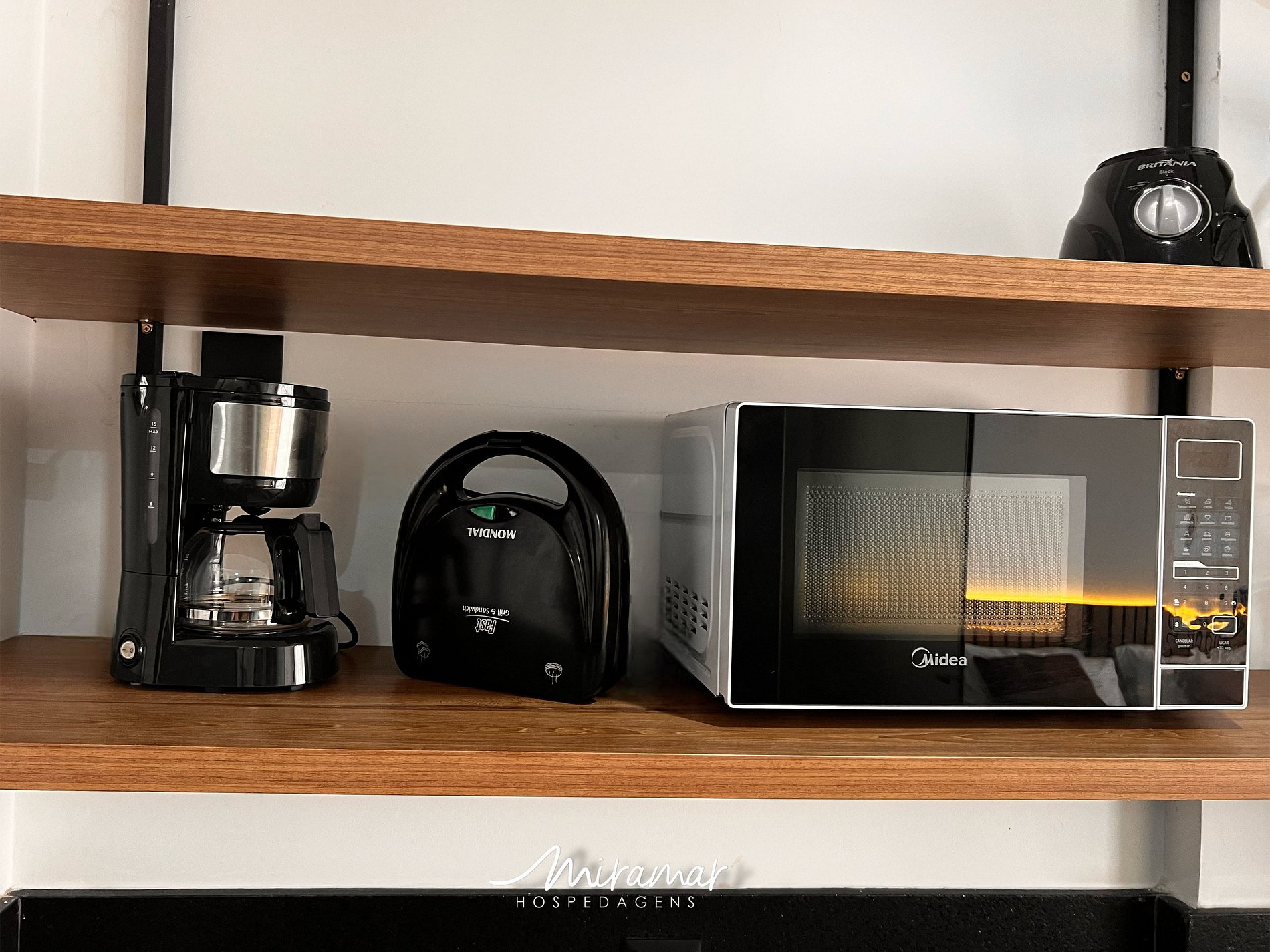 A cozinha está bem equipada e dispõe de eletrodomésticos essenciais como frigobar, sanduicheira, liquidificador, fogão portatil e micro-ondas, oferecendo tudo o que você precisa para preparar refeições rápidas e práticas. Cada detalhe foi pensado para garantir máxima funcionalidade e praticidade. Na sala, há uma bancada versatil com duas cadeiras, perfeita não apenas para o preparo de refeições, mas também para aqueles momentos em que você precisa trabalhar ou fazer anotações.