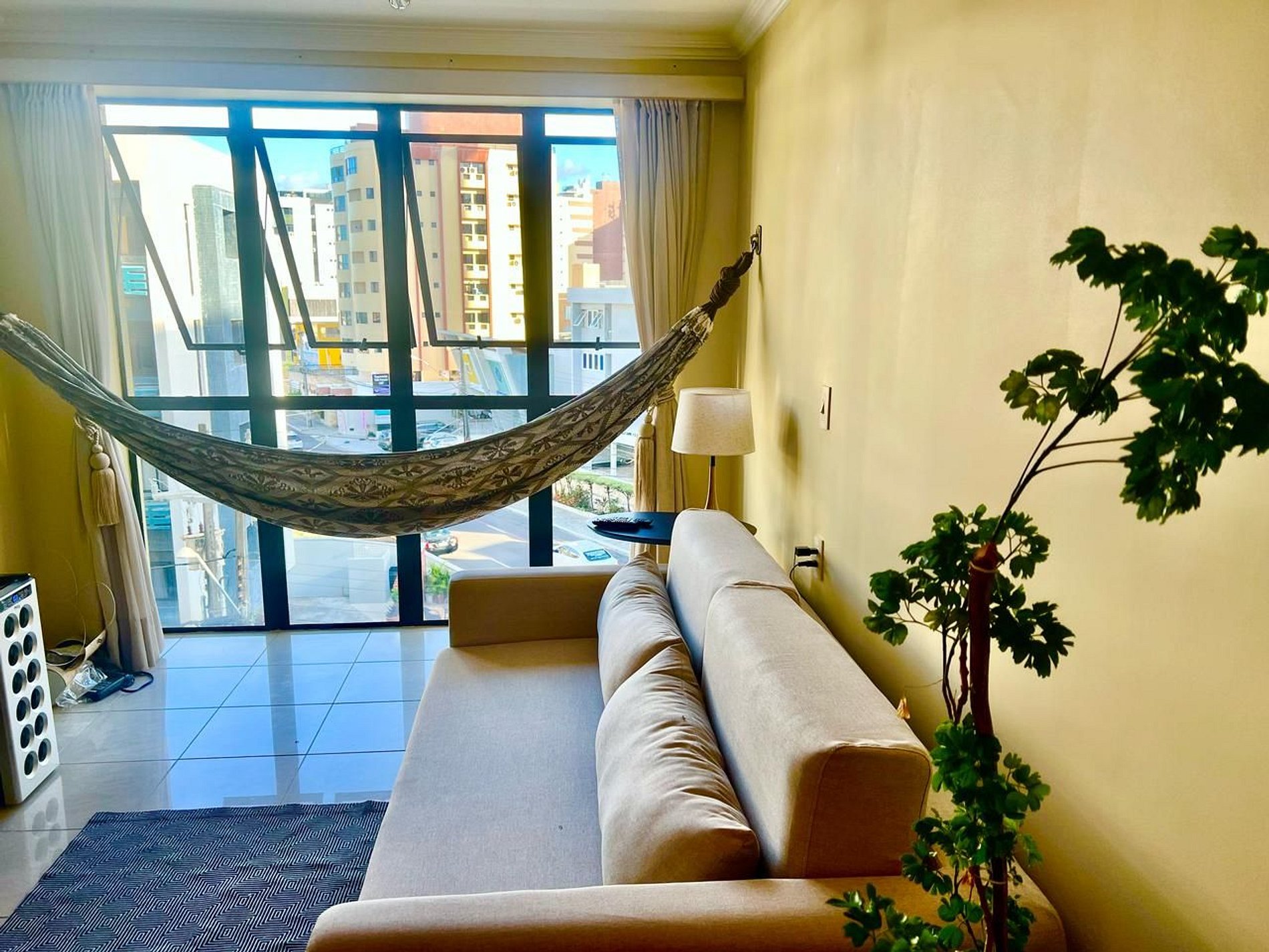 Vista belíssima, ampla , com parede toda de vidro e Cortina de linho fino para momentos de privacidade