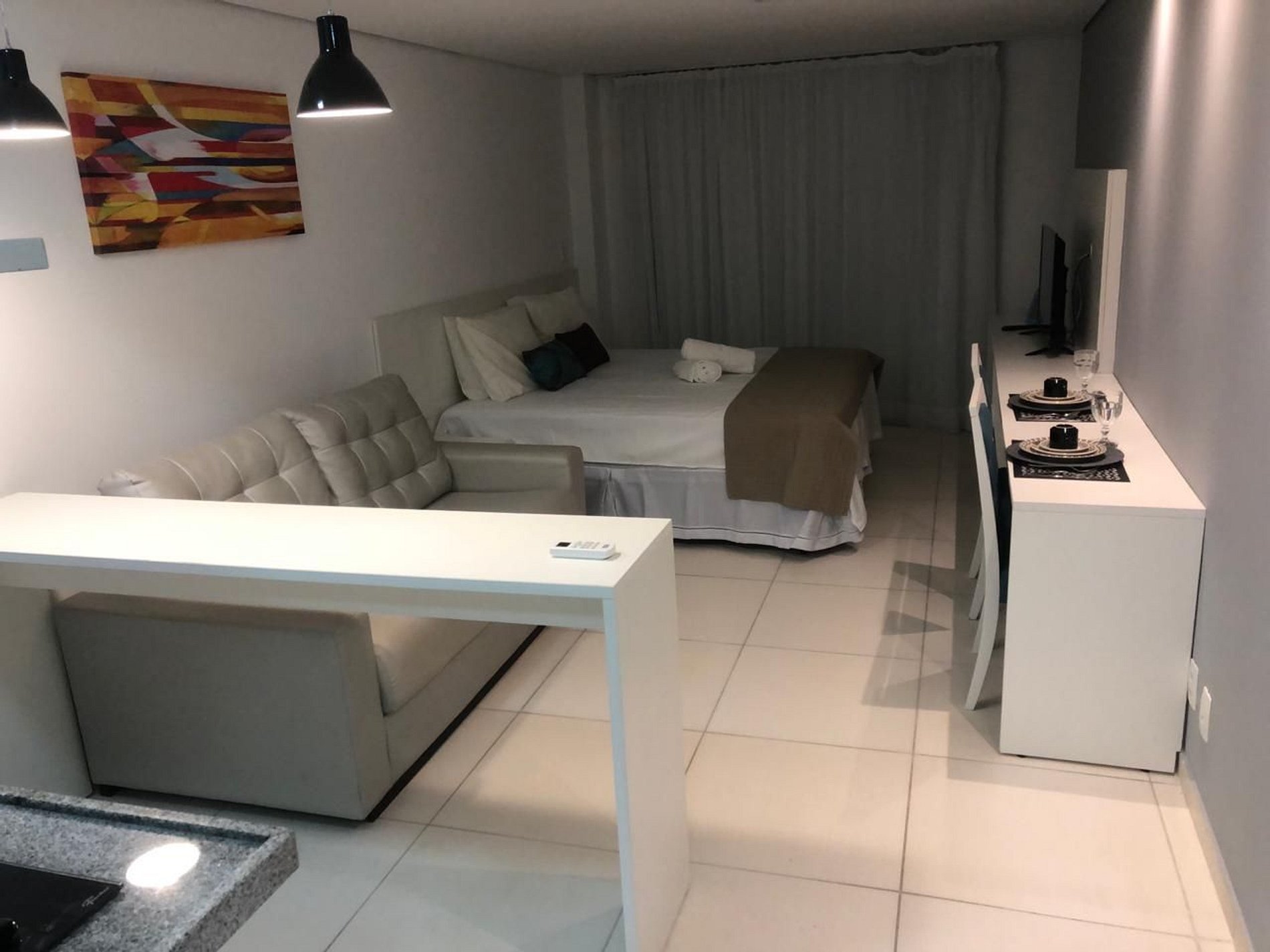 O Flat conta com copa completa para 3 pessoas (talheres, copos de água, de vinho e de cerveja, panelas, liquidificador, micro-ondas, cooktop), cama grande, sofá, sistema de iluminação, ar condicionado, além de piscina e academia completa.