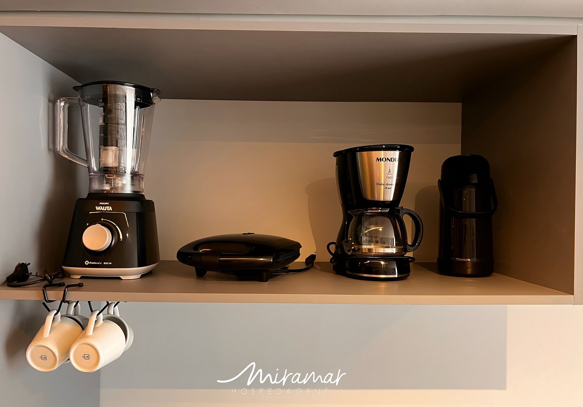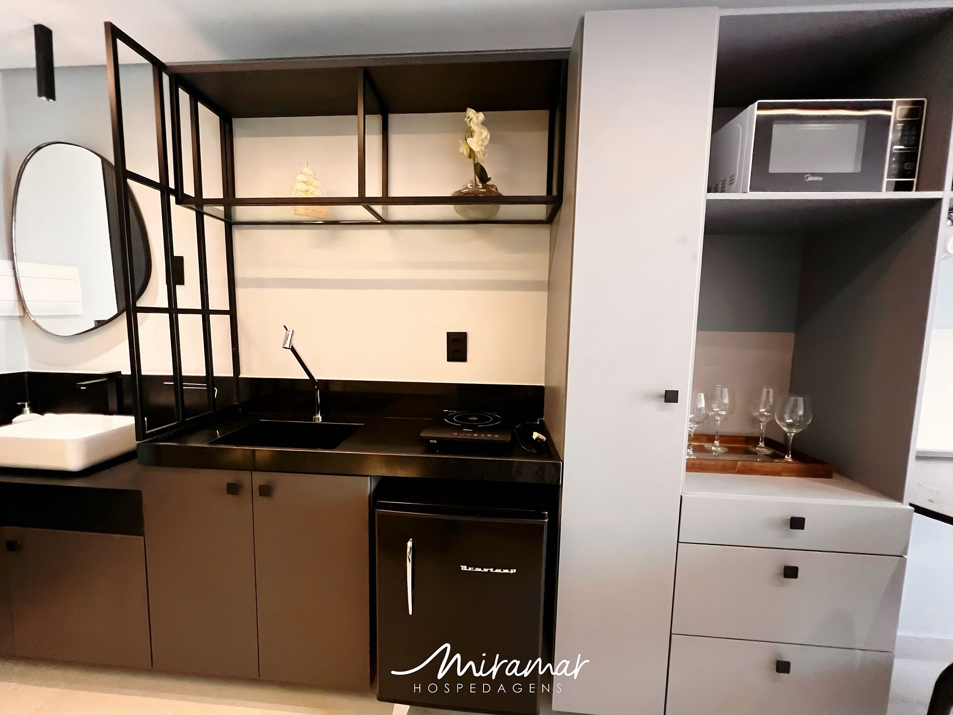 A cozinha compacta está equipada com frigobar, fogão elétrico, micro-ondas e cafeteira de cápsulas, facilitando o preparo de refeições rápidas. Além disso, oferecemos enxoval completo com lençóis e toalhas, e uma mesa com cadeira para que você desfrute suas refeições com conforto.