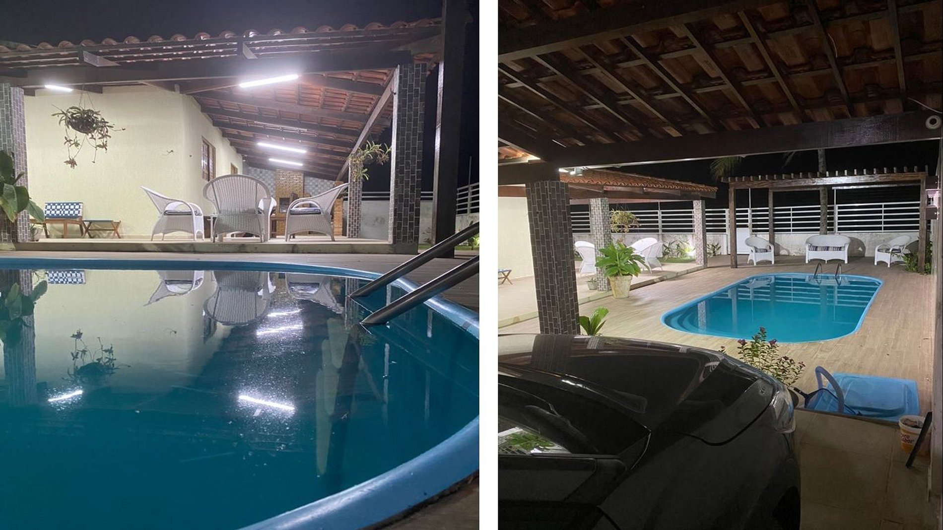 Possuí câmeras de segurança nas partes externas da casa, na área da piscina e na sala!