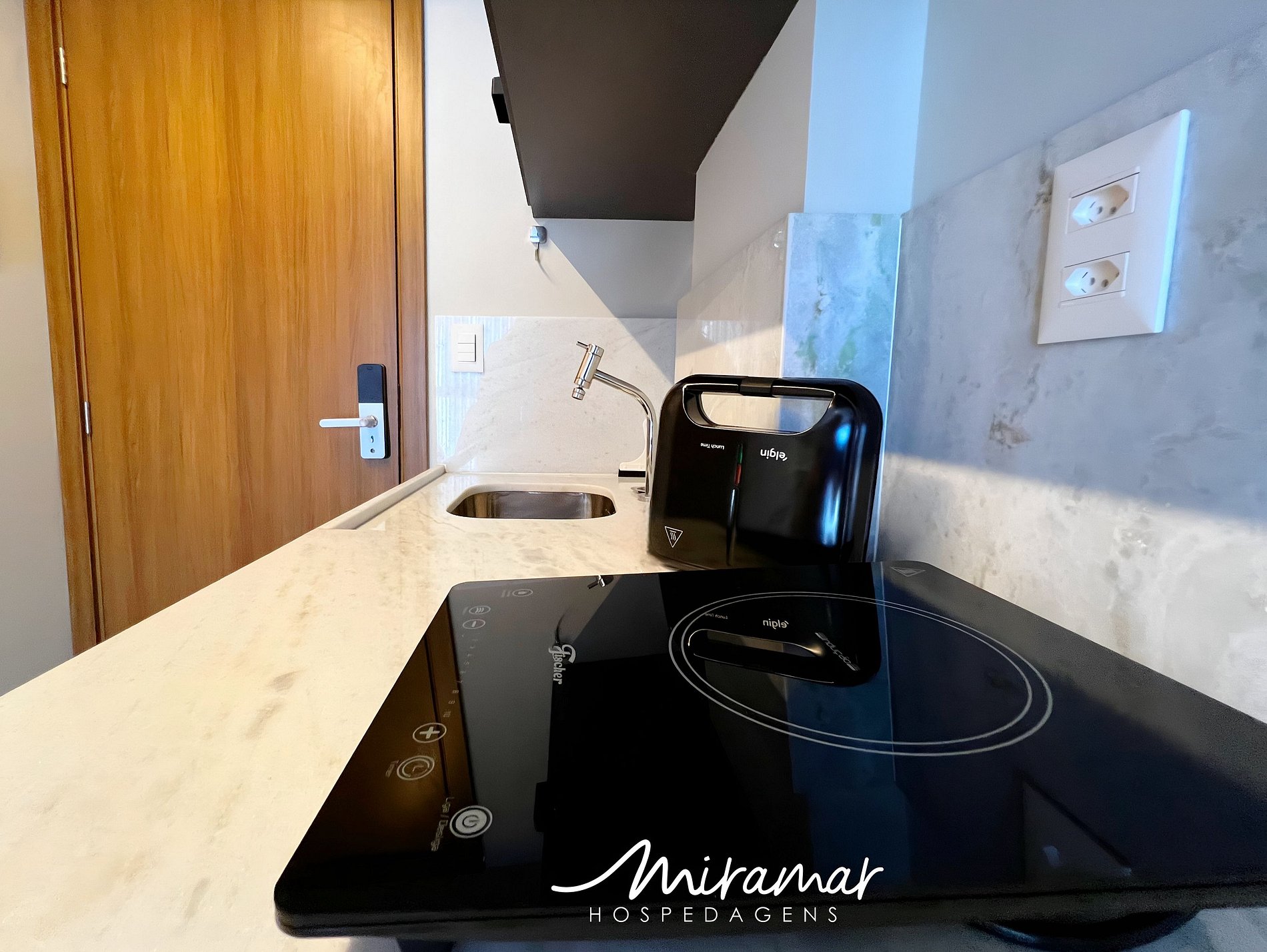 Cozinha compacta com: frigobar, micro-ondas, cafeteira, cooktop (1 boca), sanduicheira e liquidificador