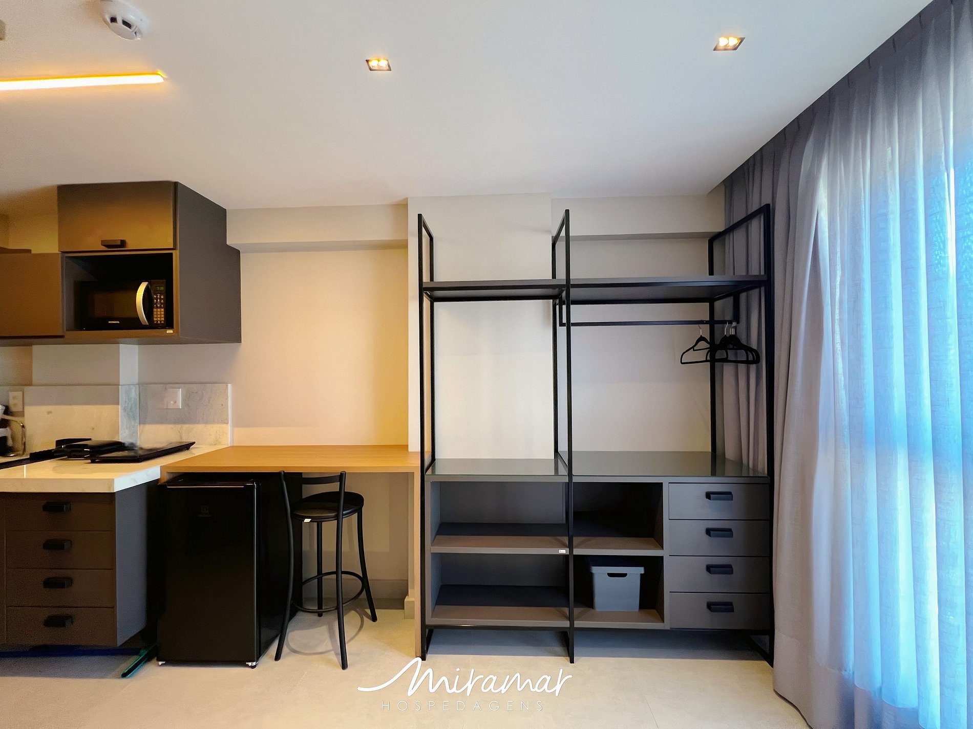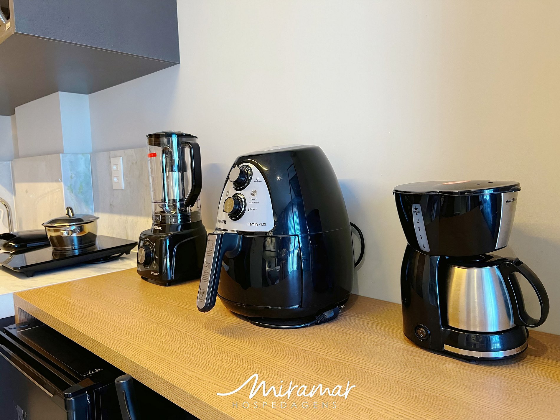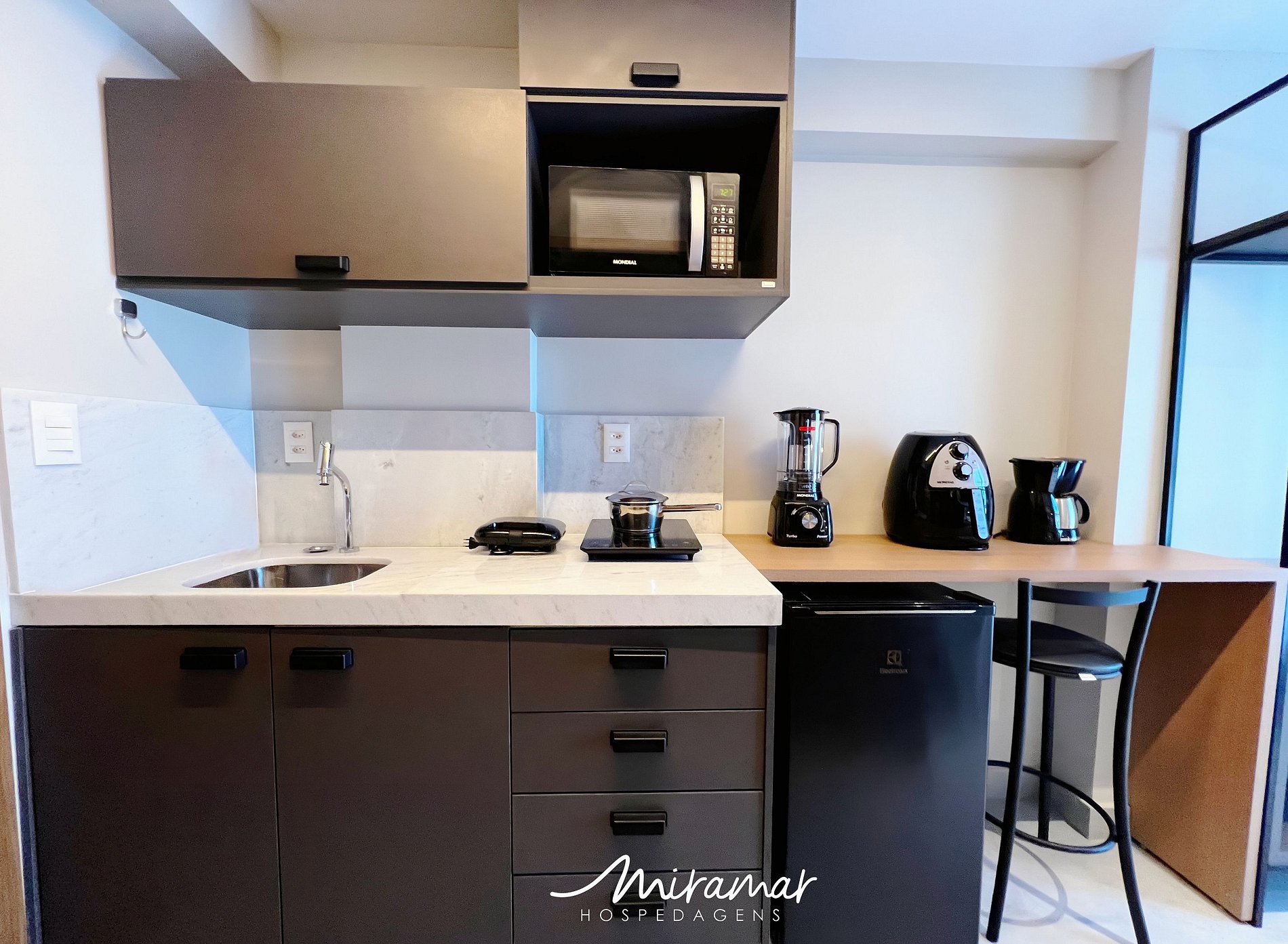 Cozinha compacta com: frigobar, micro-ondas, cafeteira, cooktop (1 boca), sanduicheira e liquidificador