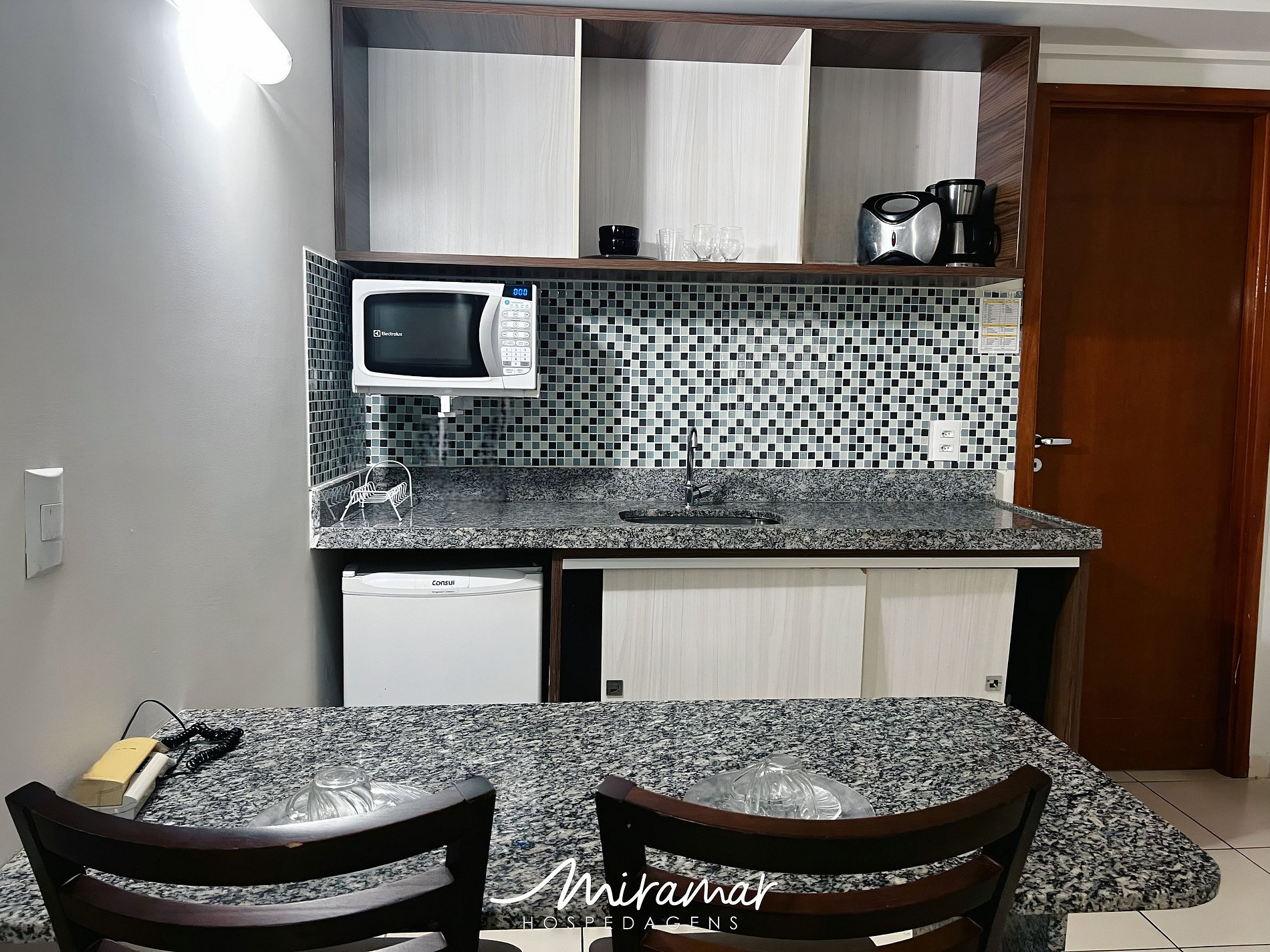 A varanda revela uma vista encantadora da praia perfeita para contemplar o nascer do sol ou relaxar ao som das ondas. O espaço é dividido em quarto e sala em estilo cozinha americana, com sofá-cama, bancada com duas cadeiras e cozinha equipada com os eletrodomésticos básicos. Acomoda para dormida até 4 hóspedes.