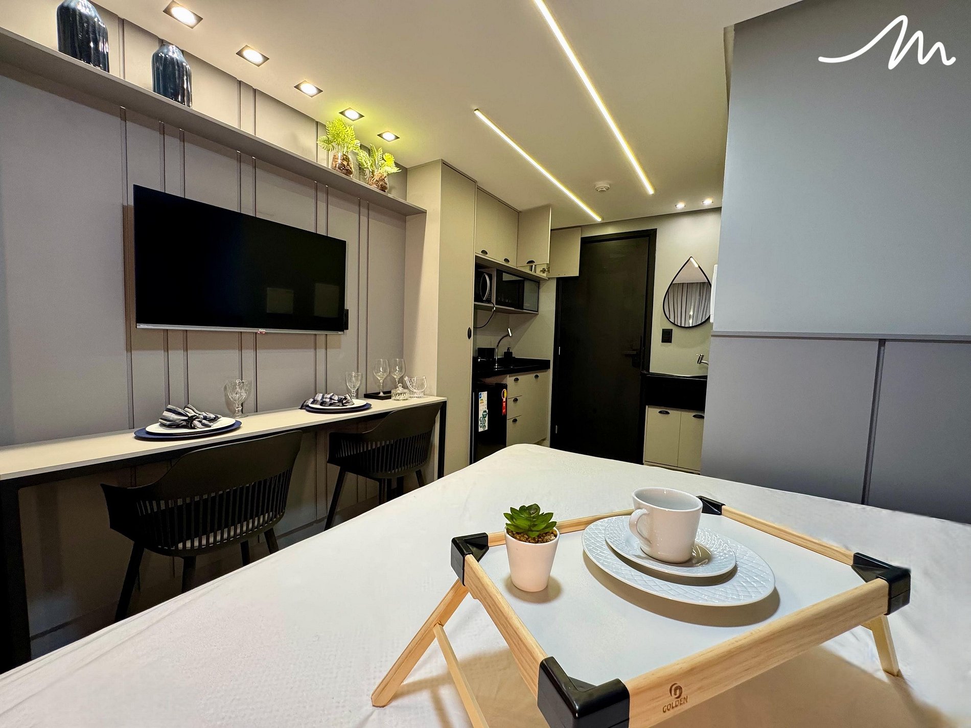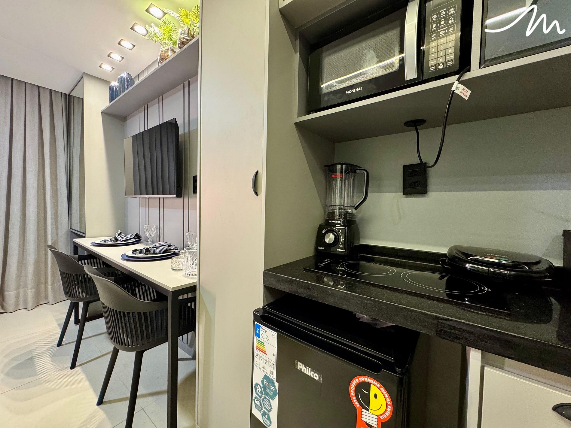 A bancada com duas cadeiras tem dupla função: perfeita para refeições rápidas ou para quem precisa abrir o notebook e trabalhar com vista para o litoral. Já a cozinha compacta e funcional é equipada com frigobar, cooktop, liquidificador, cafeteira, sanduicheira, além de louças e talheres tudo o que você precisa para preparar um lanche ou até mesmo aquele café da manhã especial.