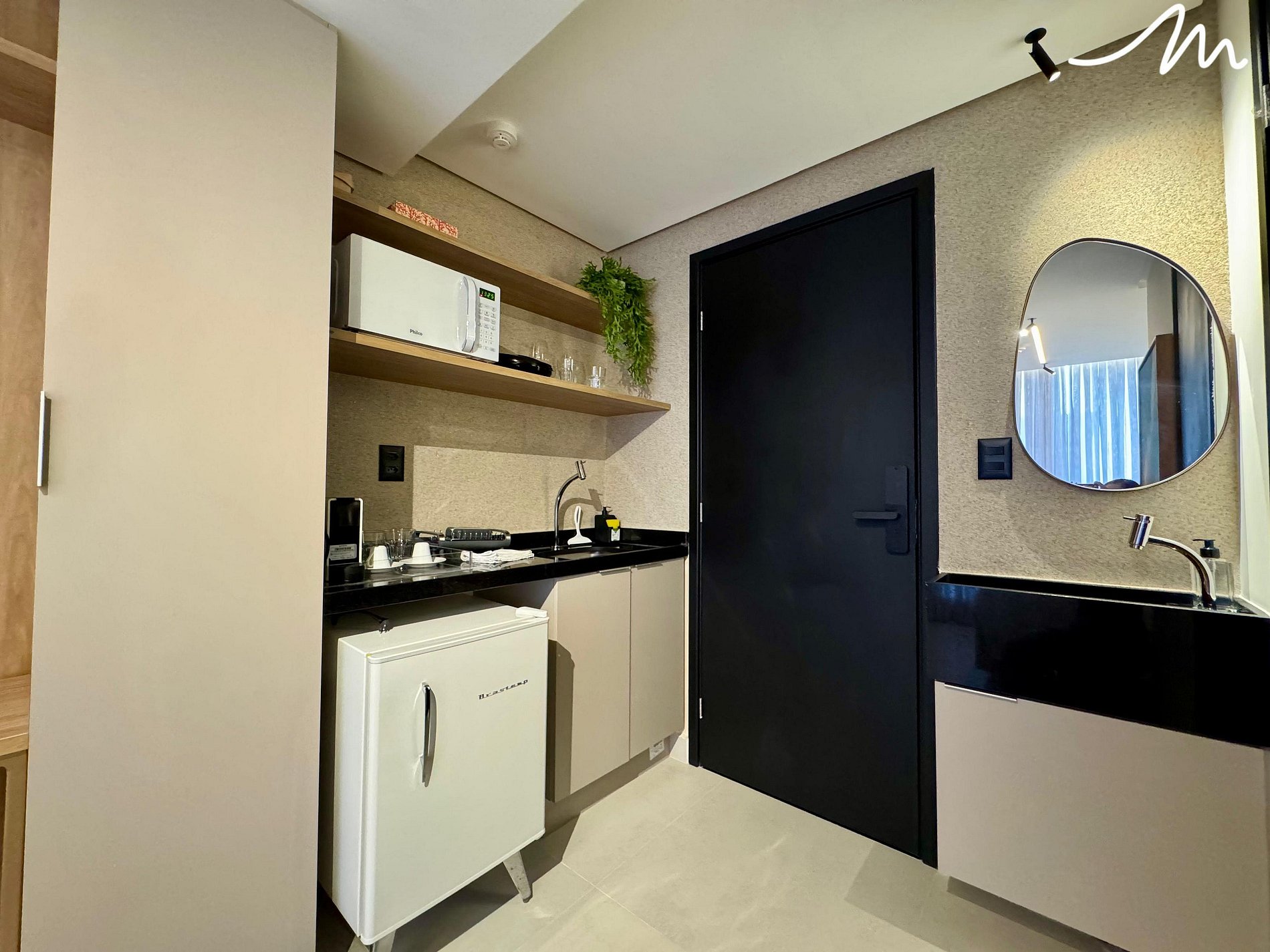 A bancada com duas cadeiras atende a diferentes necessidades: seja para refeições rápidas, seja para quem precisa trabalhar remotamente com uma vista inspiradora para o litoral. A cozinha, compacta e bem equipada, conta com frigobar, fogão por indução (móvel), cafeteira, sanduicheira, além de louças e talheres tudo o que você precisa para preparar um lanche ou um café da manhã especial.