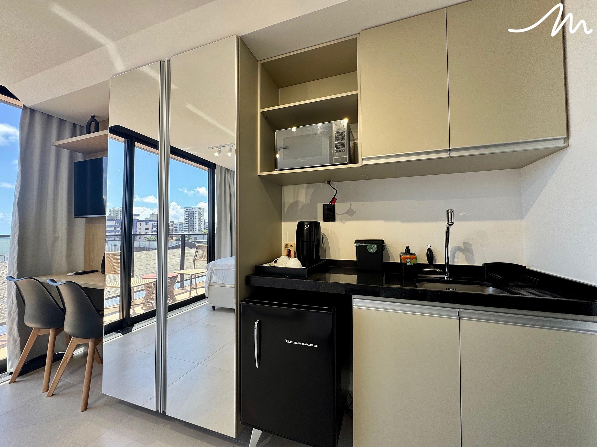 A bancada com duas cadeiras é versátil: pode ser o cenário para um jantar intimista ou o seu cantinho de trabalho com vista para o paraíso. Já a cozinha compacta é equipada com tudo o que você precisa: frigo bar, sanduicheira, micro-ondas, cafeteira, além de louças e talheres perfeita para preparar um café fresquinho ou um lanche rápido antes de explorar a cidade.