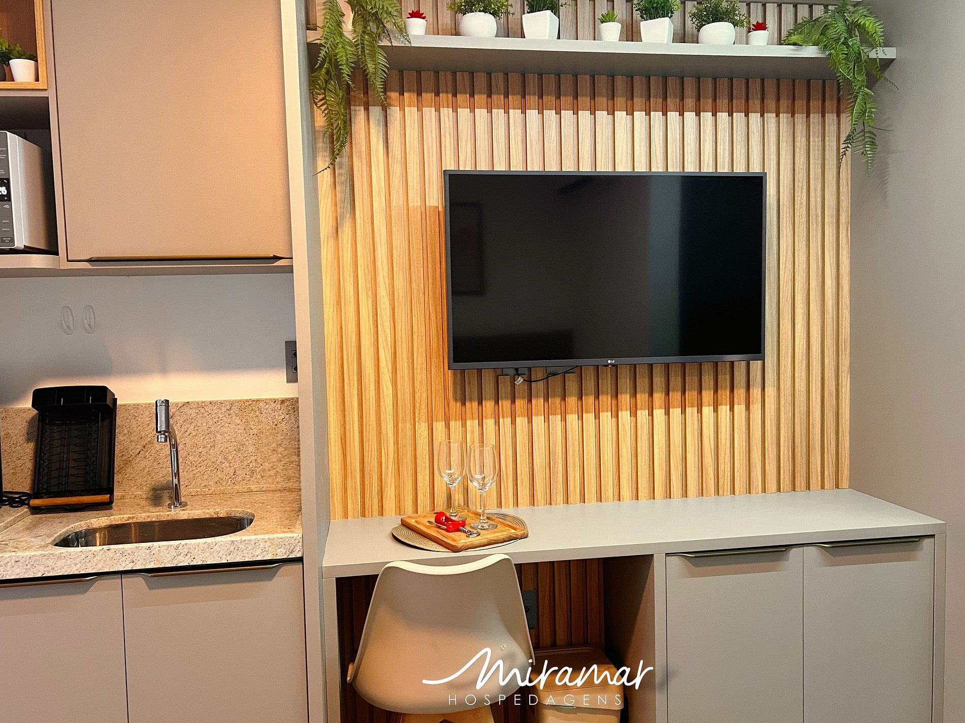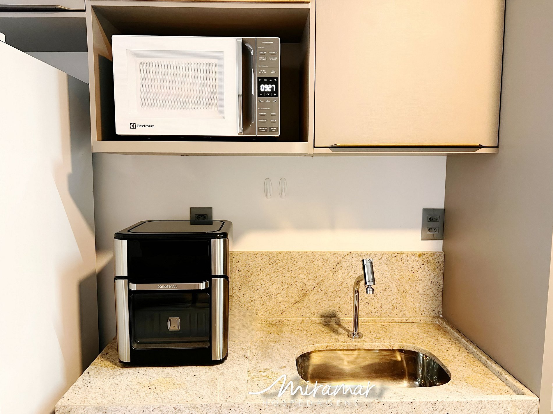 A cozinha, compacta e em estilo americano, é prática e funcional. Conta com geladeira, micro-ondas, sanduicheira, além de louças e talheres para sua conveniência. A bancada com duas cadeiras é ideal para refeições rápidas ou até mesmo para quem precisa trabalhar durante a viagem.