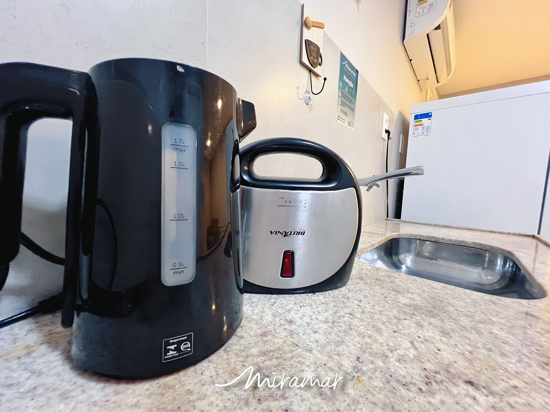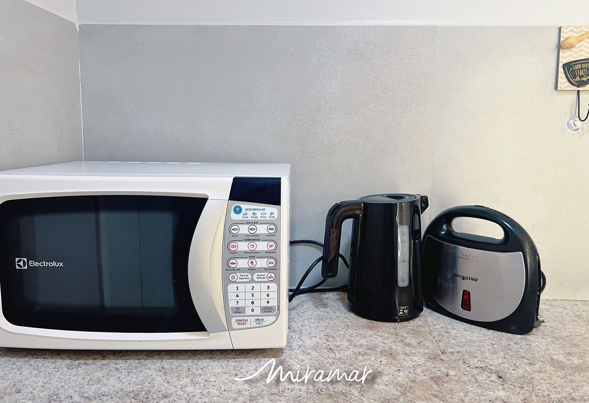 A cozinha é equipada com armário, geladeira, micro-ondas, sanduicheira, chaleira elétrica, além de louças e talheres, atendendo bem às necessidades do dia a dia. Para maior transparência, destacamos que o imóvel conta exatamente com os itens descritos, não sendo disponibilizados outros utensílios ou equipamentos além dos mencionados.