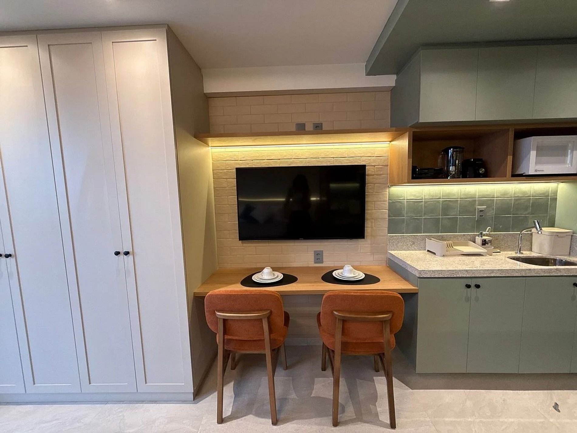 Come and stay in this cozy flat in the Garden Haus building, ideal for up to 4 people. The unit has a balcony and a side view of the sea, as well as air conditioning for greater comfort. It has 1 queen bed and 2 extra beds, a wardrobe and a TV. The compact, practical and functional kitchen has essential items for preparing quick meals. Comfort, convenience and a prime location await you!