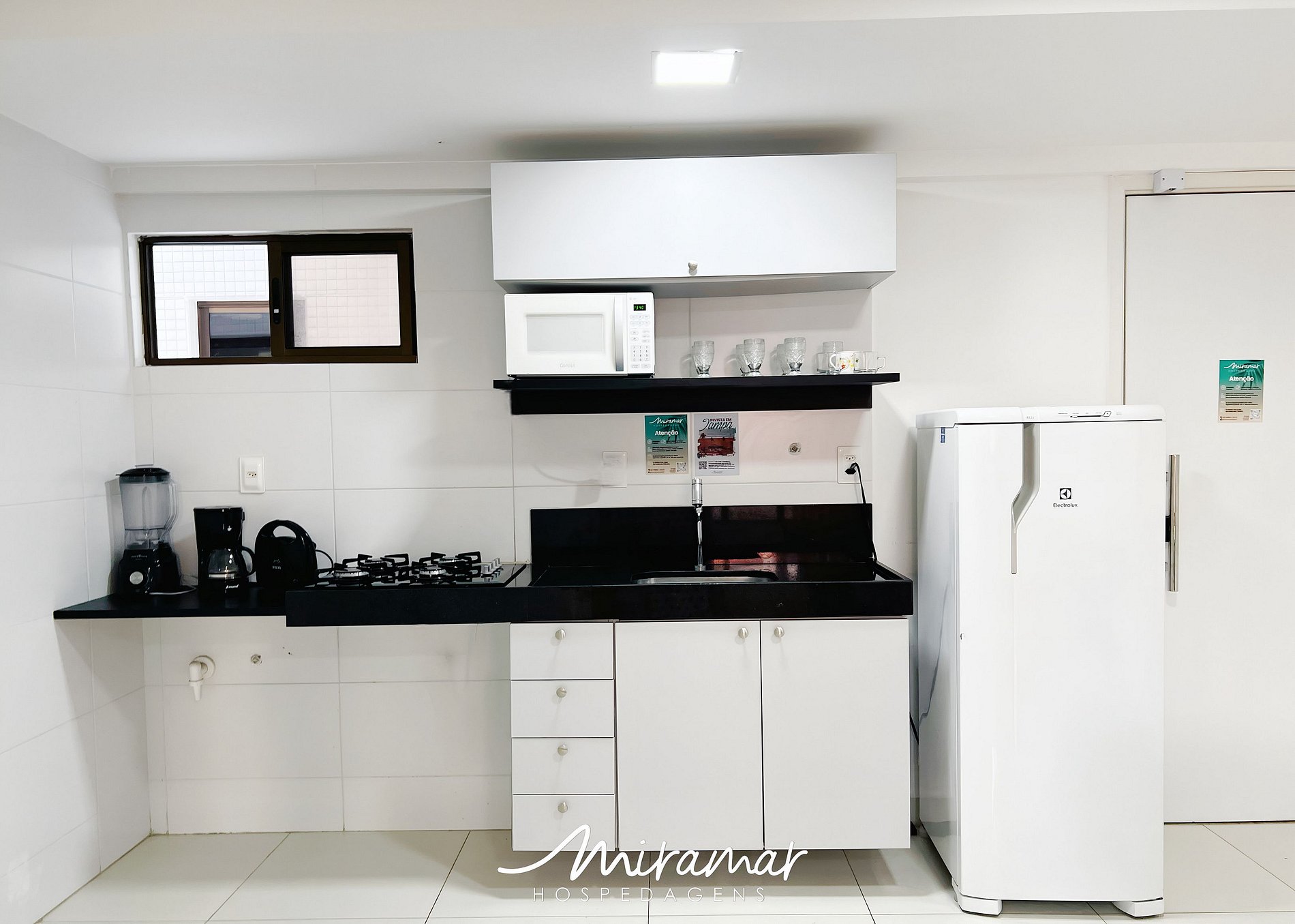 -Cozinha americana equipada com geladeira, fogão, micro-ondas, louças e talheres – tudo o que você precisa para preparar suas refeições com praticidade.