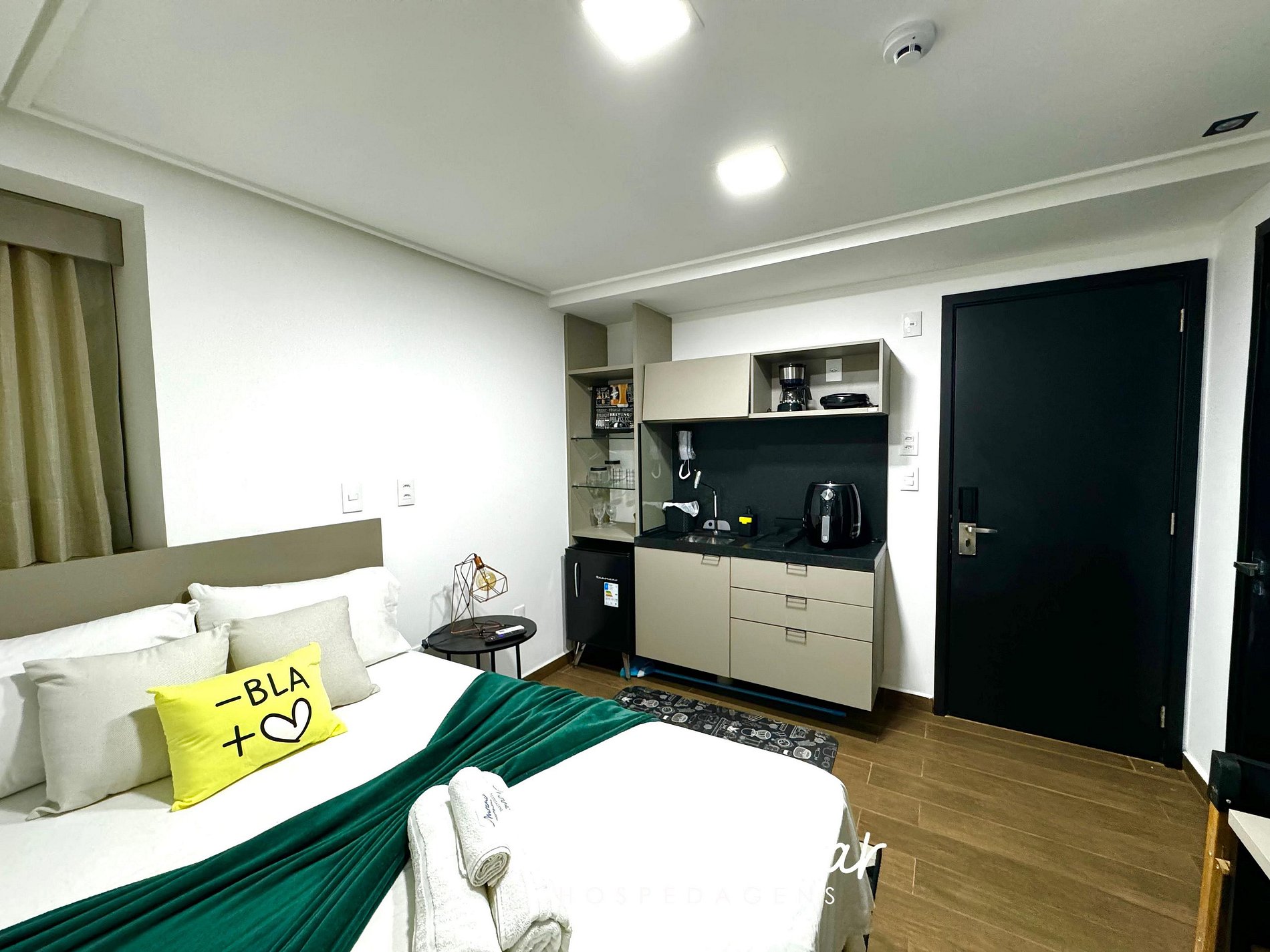Nosso aconchegante flat oferece uma estadia confortável com uma cama de casal , uma TV e ar-condicionado, garantindo entretenimento e relaxamento. Equipado com utensílios essenciais como cafeteira, air fryer e sanduicheira, o espaço é ideal para preparar refeições rápidas. Combinando conveniência e conforto, o flat proporciona uma experiência de estadia verdadeiramente excepcional.