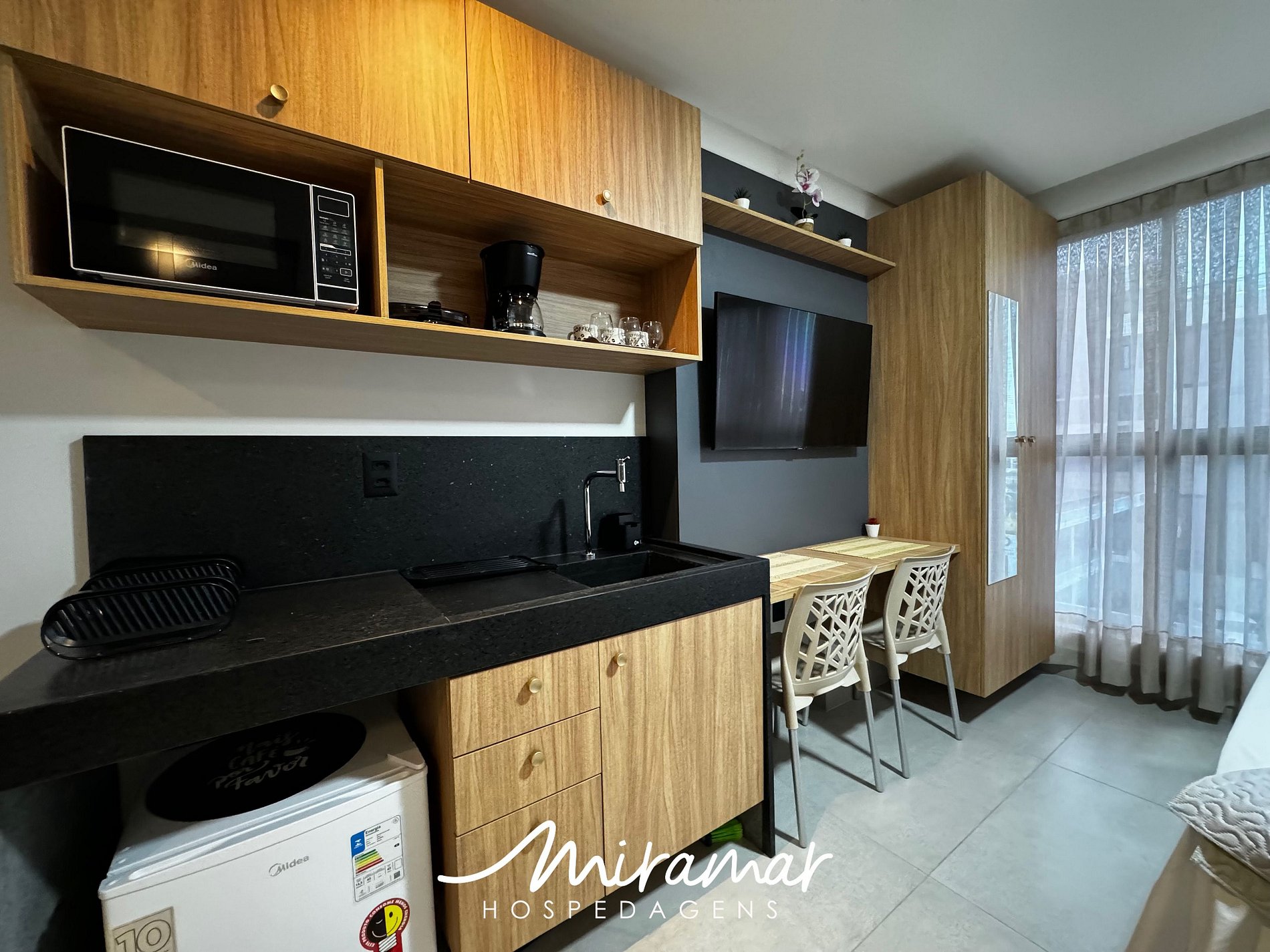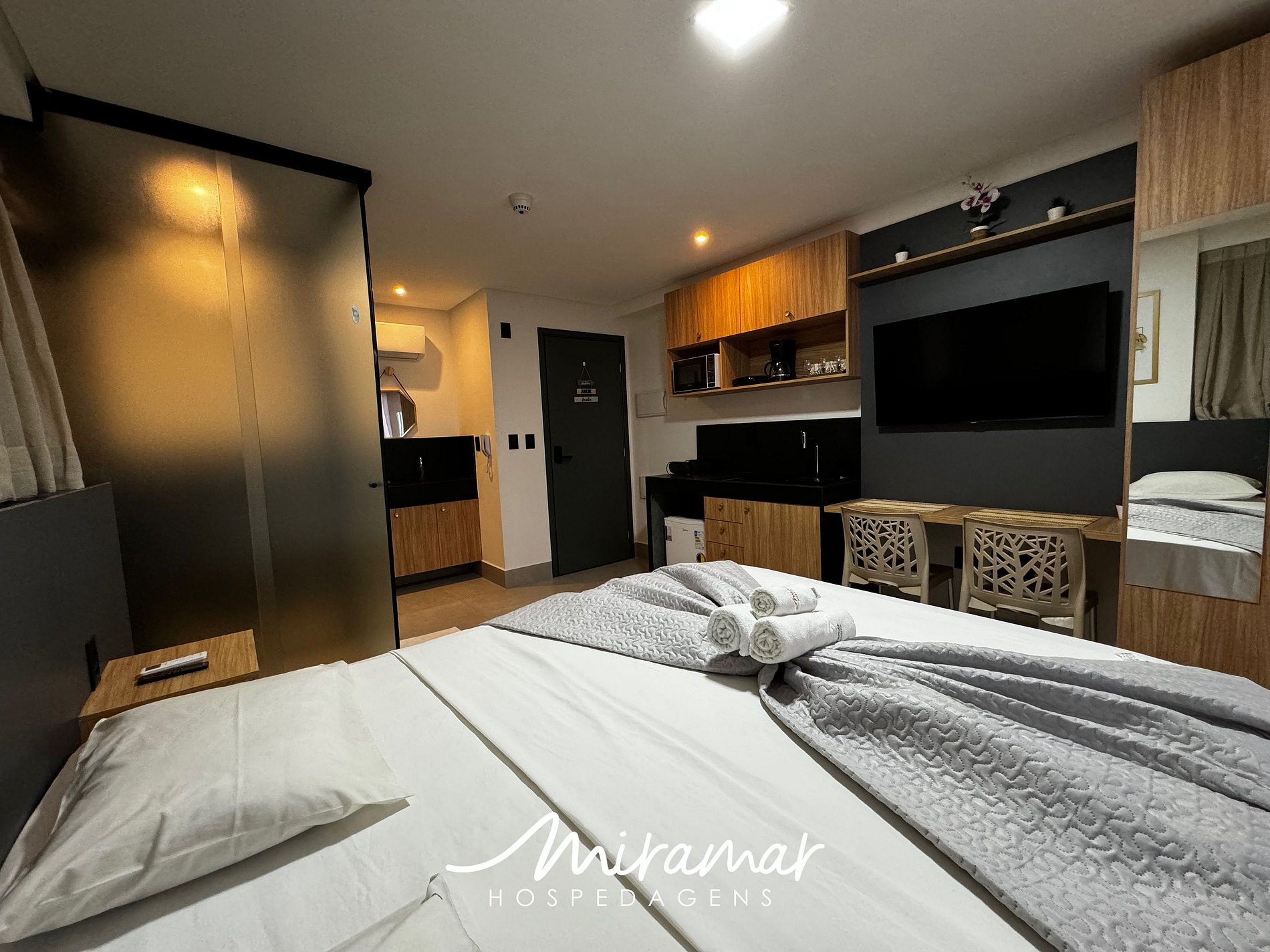 As comodidades incluem uma cama de casal confortável para garantir noites de sono revigorantes e relaxantes, além de uma Smart TV, ideal para entretenimento em momentos de descanso. A cozinha é equipada com eletrodomésticos modernos como frigobar, cooktop e micro-ondas, facilitando a preparação de refeições rápidas e práticas. Fornecemos também enxoval de cama e banho, com lençóis e toalhas, além de utensílios básicos domésticos para preparar e desfrutar de refeições no conforto do seu próprio espaço.