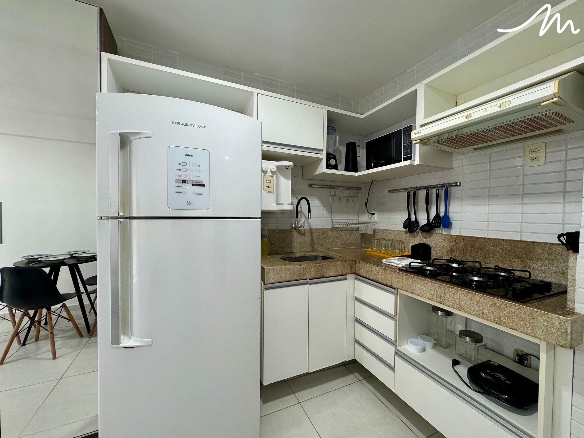 A cozinha é funcional e bem equipada com tudo que você precisa para preparar desde um lanche rápido até uma refeição completa: fogão, micro-ondas, geladeira, sanduicheira e liquidificador à sua disposição.
