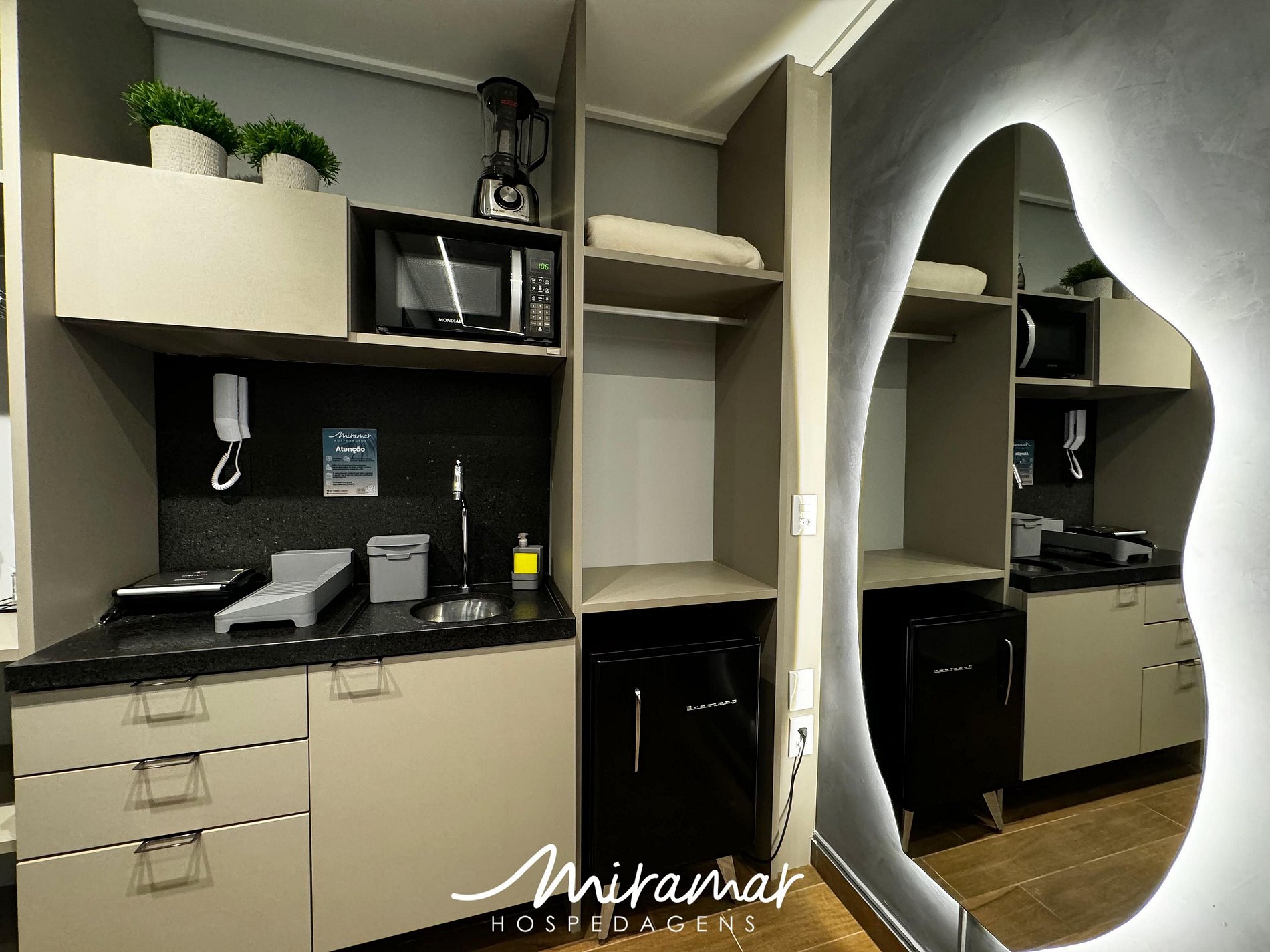 Na cozinha compacta, você encontrará todos os eletrodomésticos necessários para preparar refeições práticas, como micro-ondas, cafeteira, frigobar, sanduicheira e liquidificador. Para seu conforto, a unidade também dispõe de ferro de passar roupas e secador de cabelo.