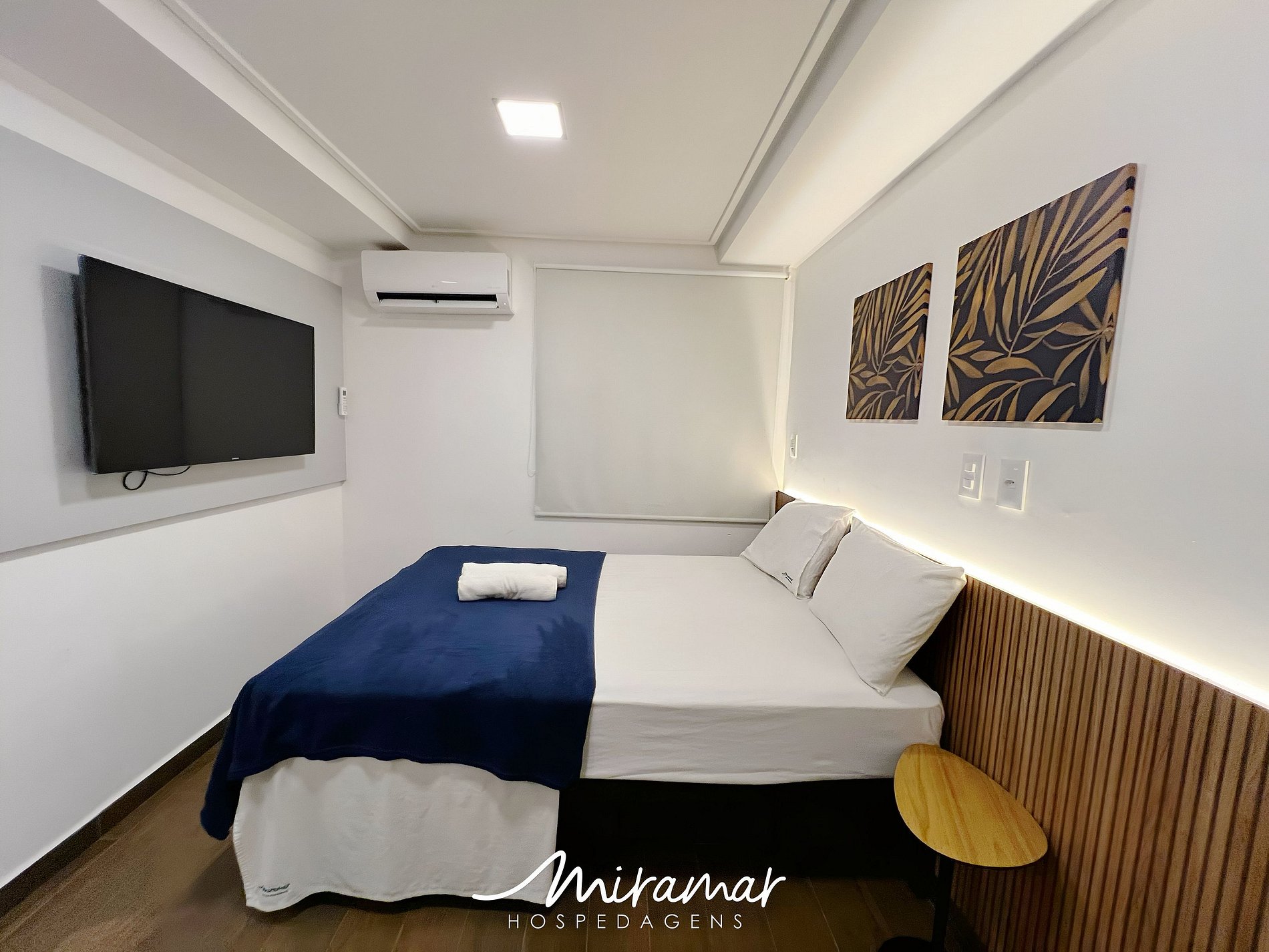 Este elegante studio acomoda até 3 pessoas, com uma cama de casal e uma cama auxiliar posicionada no chão, que pode ser puxada quando necessário. O ambiente conta com ar-condicionado e TV, proporcionando conforto e aconchego. A cozinha é equipada com utensílios essenciais, como cafeteira, micro-ondas e sanduicheira, facilitando a preparação de refeições. Um espaço que combina elegância e praticidade para uma estadia excepcional.
