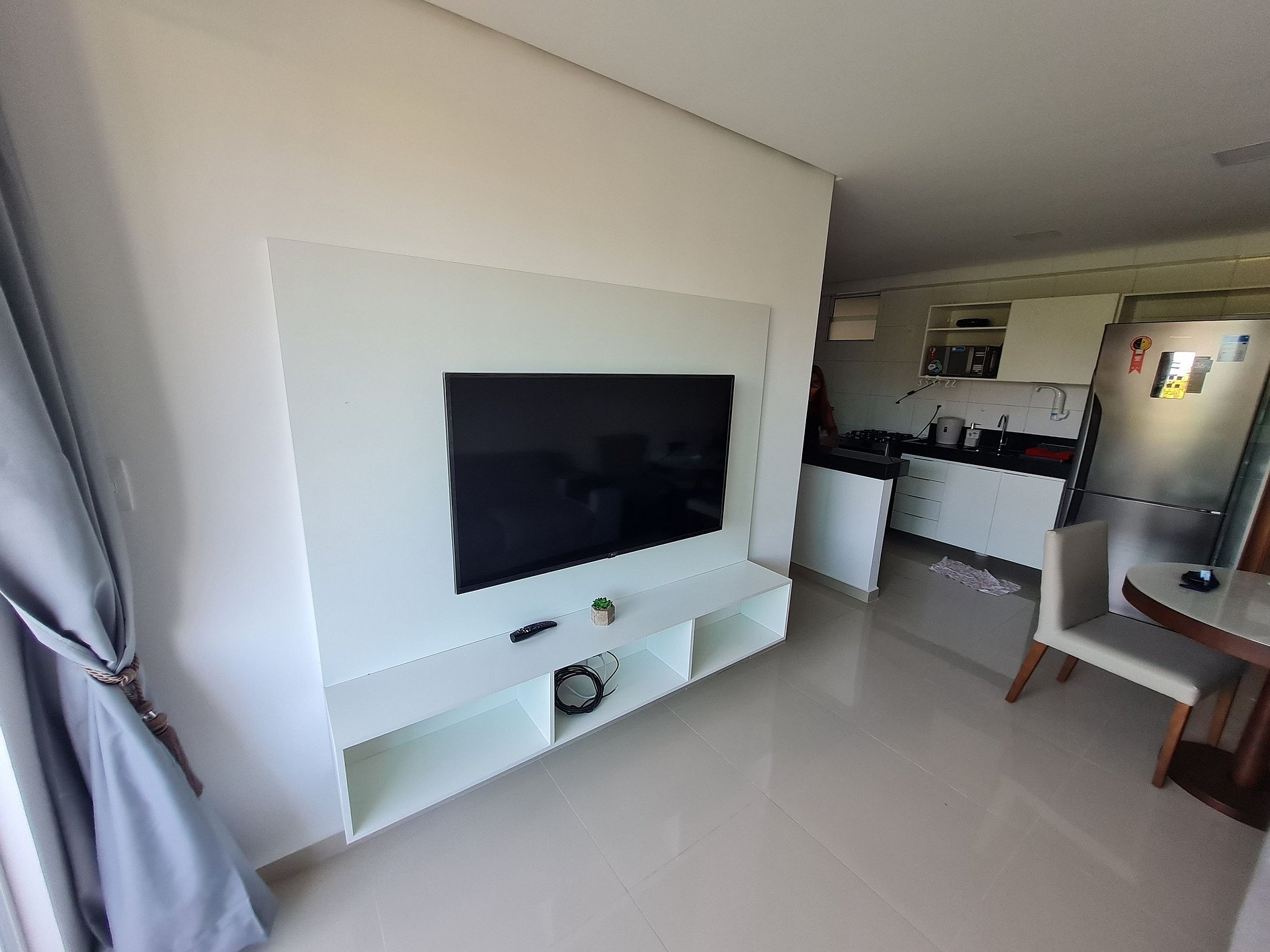 Conta ainda com banheiro social, sala de estar com sofá e smart TV, mesa de jantar com quatro cadeiras e uma cozinha completa, pensada para proporcionar praticidade durante a estadia.