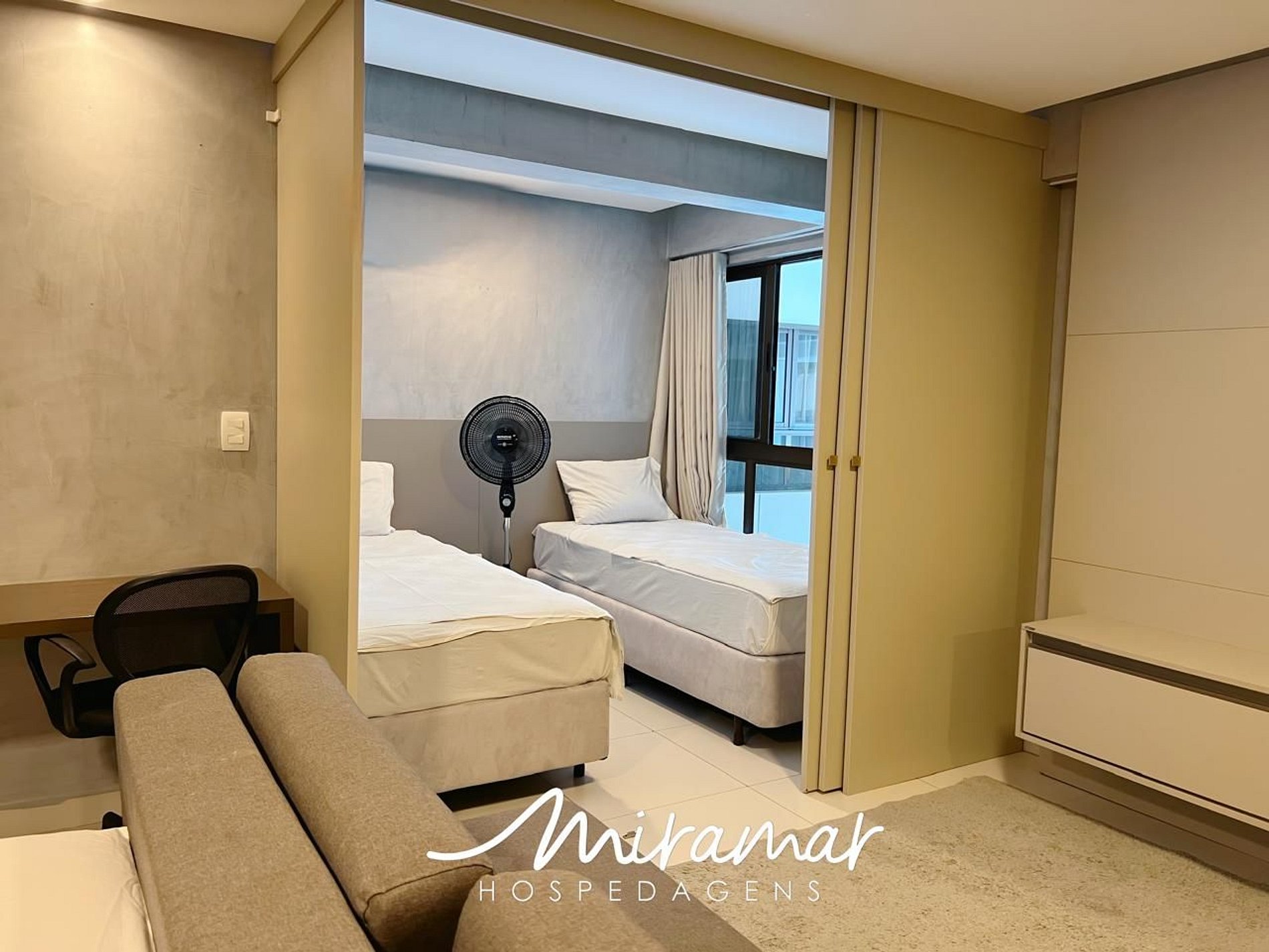 Este amplo ambiente conta com uma aconchegante cama de casal, perfeita para garantir noites tranquilas. Para maior privacidade, o espaço é dividido por uma porta de correr, revelando um segundo quarto com duas camas de solteiro e uma deslumbrante vista para o mar da janela. Se você está viajando a trabalho, aproveite a escrivaninha com cadeira ao lado da cama, ideal para usar o computador em um ambiente tranquilo. O flat é climatizado e equipado ar-condicionado e com ventiladores, proporcionando uma brisa agradável em todo o espaço.