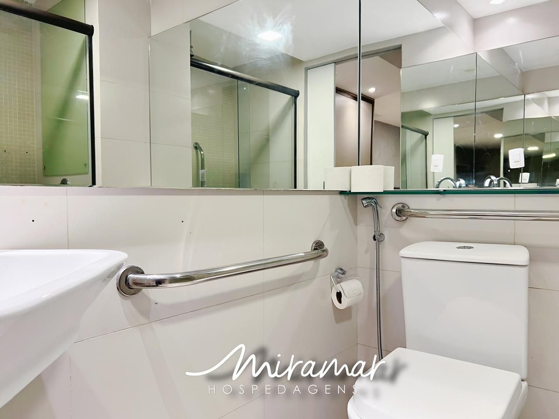 O banheiro possui barras de apoio, garantindo conforto, autonomia e segurança para pessoas com mobilidade reduzida ou necessidades especiais. Aqui, você encontrará um ambiente acolhedor e acessível, perfeito para a sua estadia.