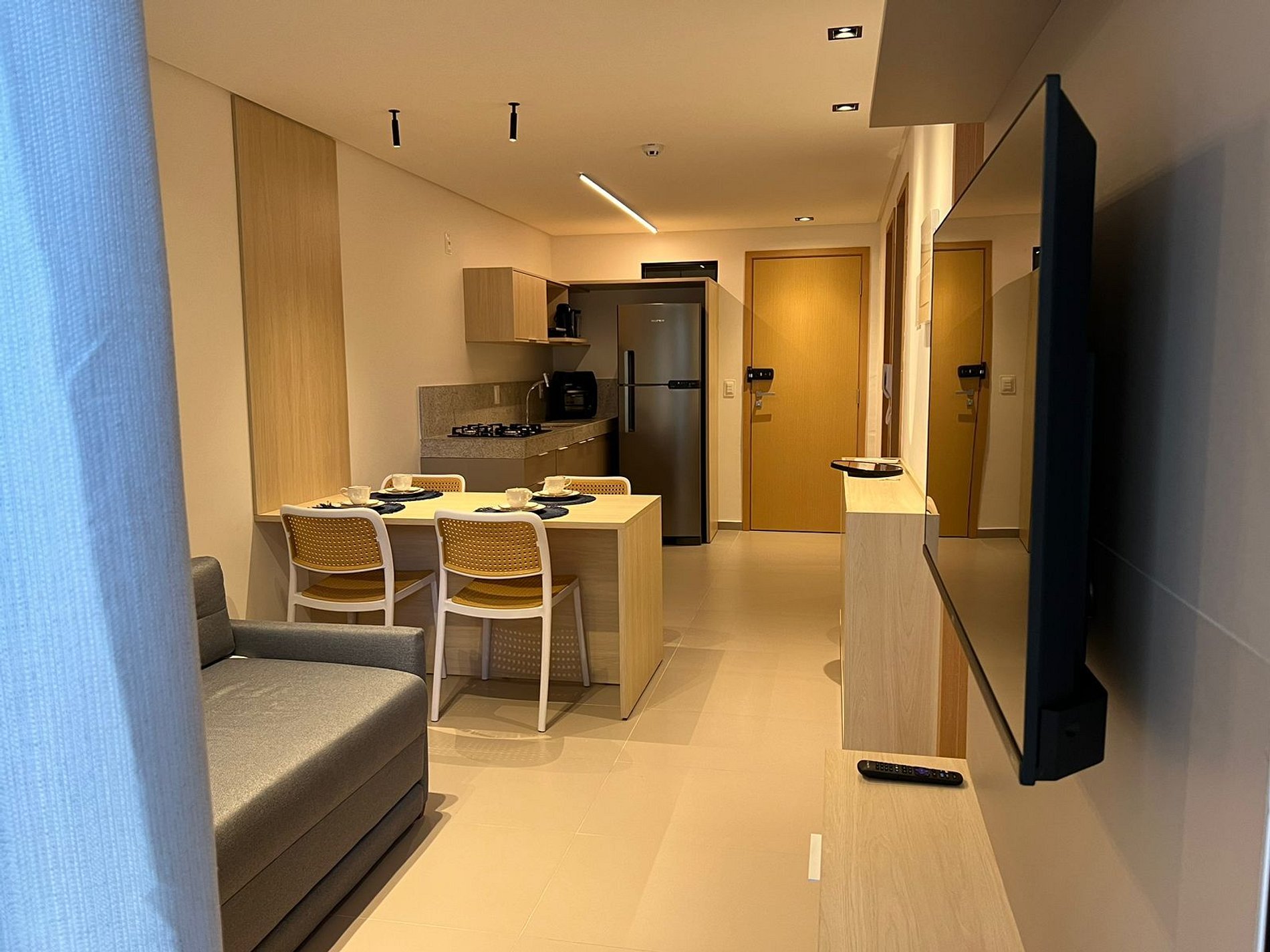 A cozinha completa está equipada com tudo o que você precisa para se sentir em casa: geladeira, fogão, sanduicheira, liquidificador e forno airfryer para preparar suas refeições. A mesa de jantar, entre a cozinha e a sala, é o lugar perfeito para compartilhar um café da manhã em família ou um jantar tranquilo.