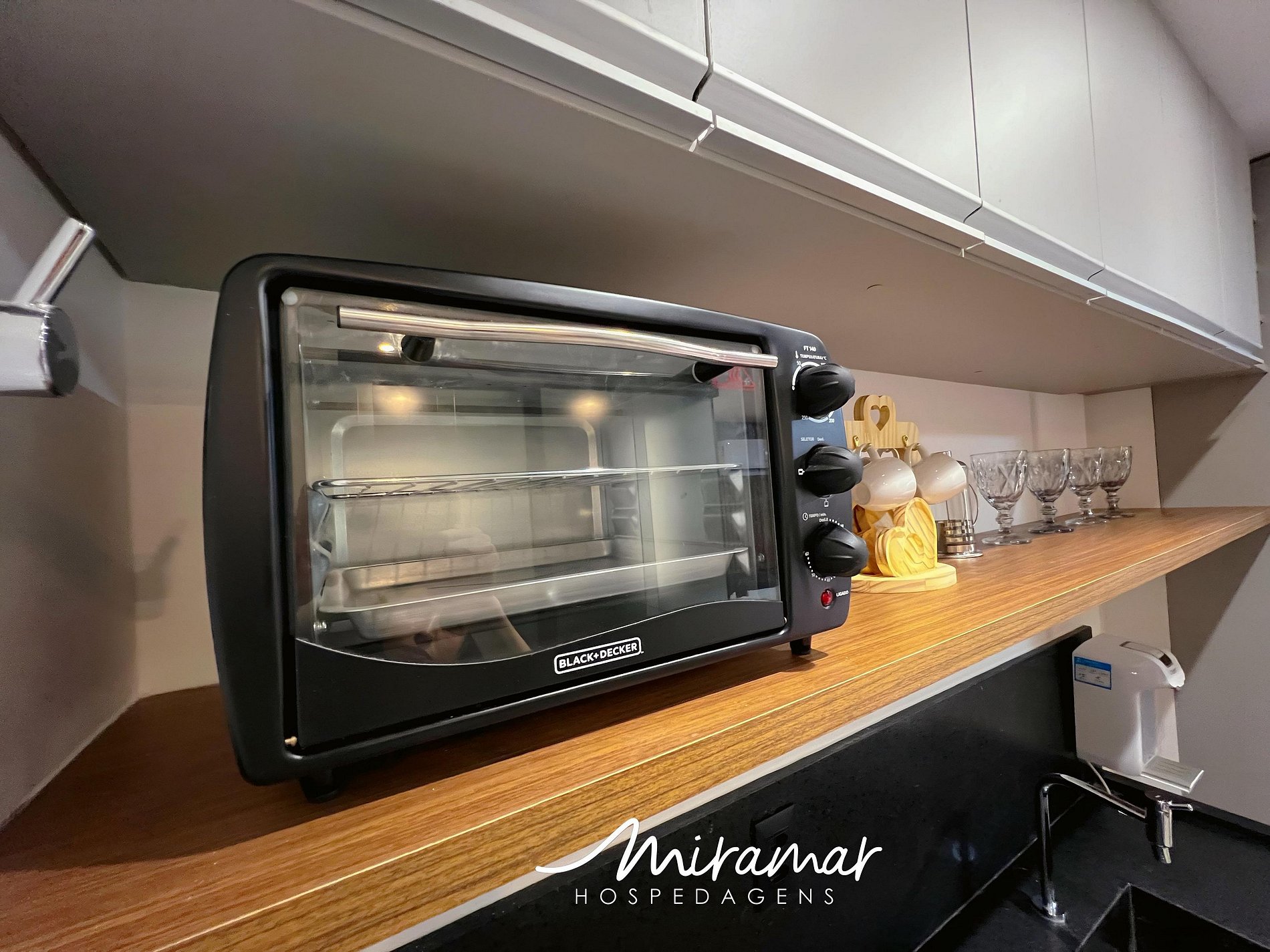 A cozinha, moderna e equipada, possui eletrodomésticos como frigobar, sanduicheira, liquidificador, forno eletrico e um purificador de agua, facilitando o preparo de refeições rápidas e práticas. Oferece também um enxoval de cama e banho com lençóis e toalhas, para que sua estadia seja ainda mais confortável e agradável. É o espaço perfeito para relaxar e se sentir em casa!