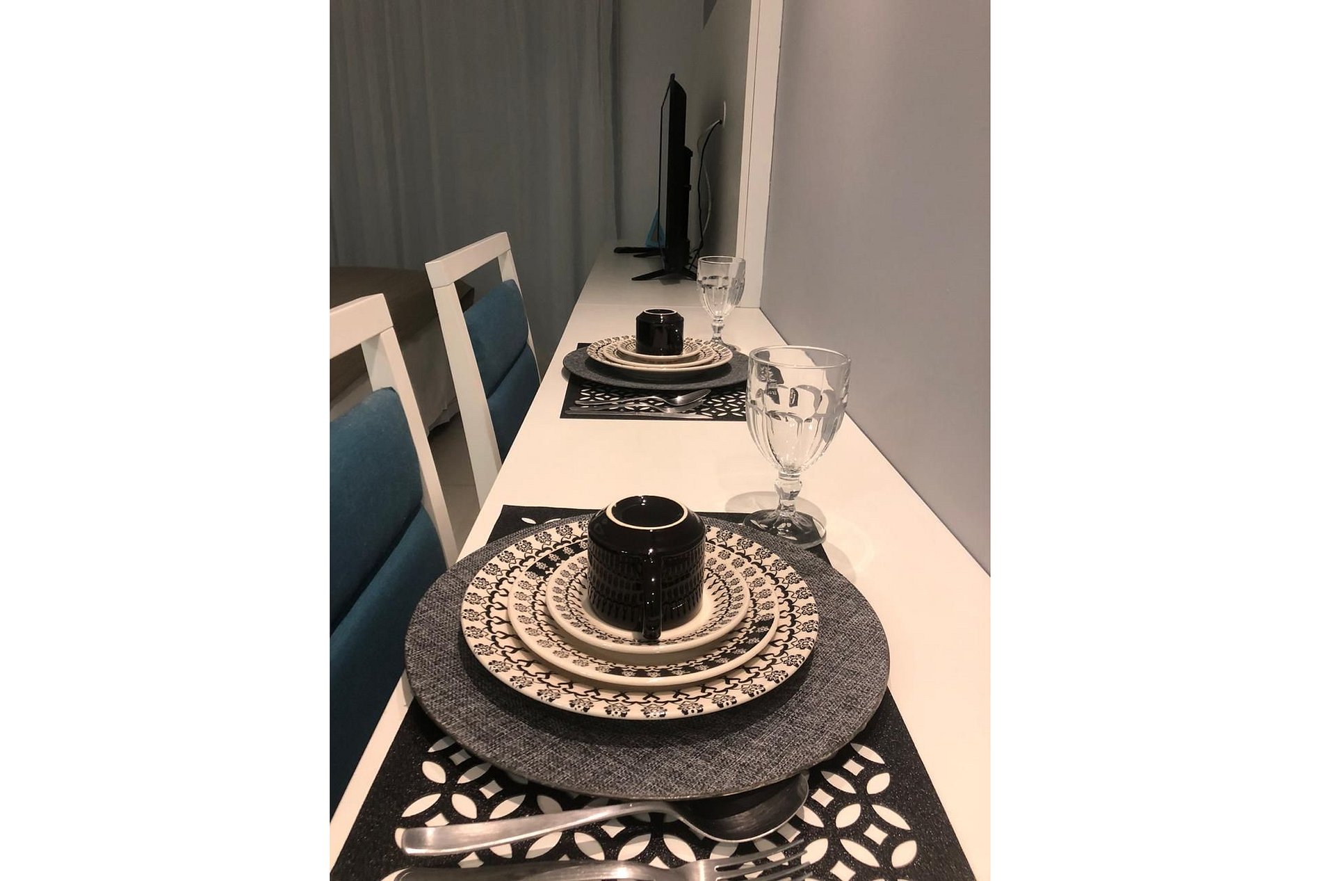 O Flat conta com copa completa para 3 pessoas (talheres, copos de água, de vinho e de cerveja, panelas, liquidificador, micro-ondas, cooktop), cama grande, sofá, sistema de iluminação, ar condicionado, além de piscina e academia completa.