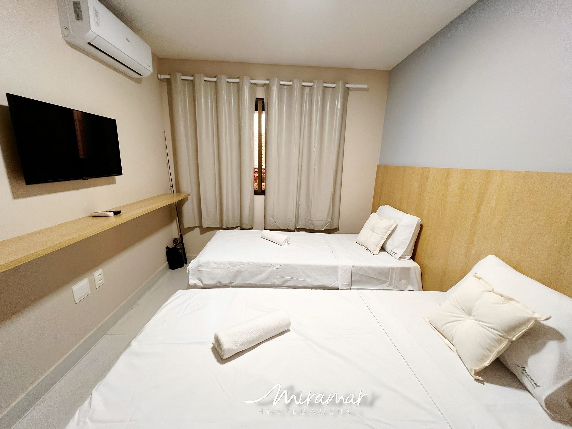 Quarto solteiro: Ideal para amigos ou crianças, conta com duas camas de solteiro com protetores, travesseiros, TV, ar-condicionado e espaço funcional para uma estadia prática e confortável.