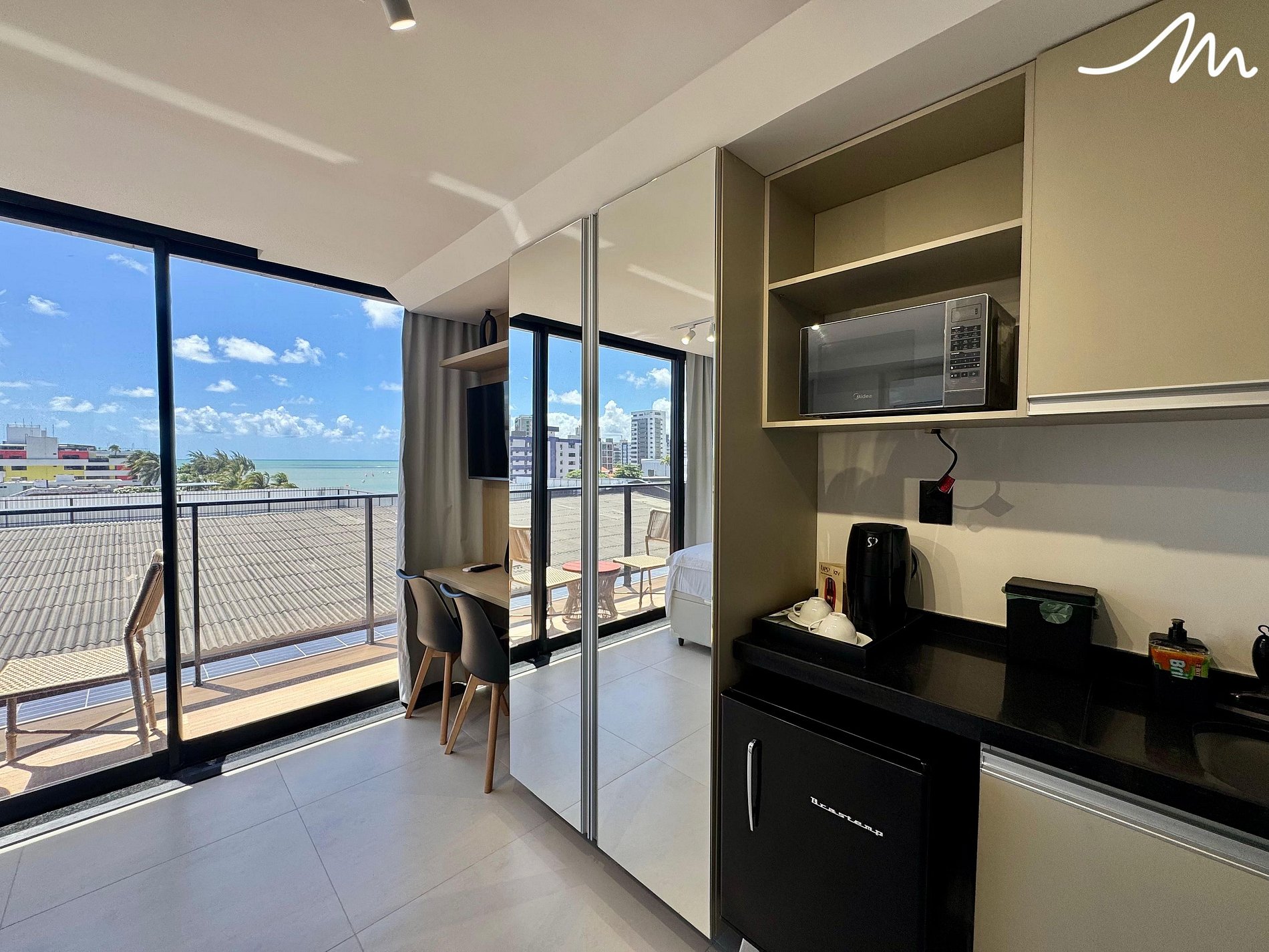 A bancada com duas cadeiras é versátil: pode ser o cenário para um jantar intimista ou o seu cantinho de trabalho com vista para o paraíso. Já a cozinha compacta é equipada com tudo o que você precisa: frigo bar, sanduicheira, micro-ondas, cafeteira, além de louças e talheres perfeita para preparar um café fresquinho ou um lanche rápido antes de explorar a cidade.