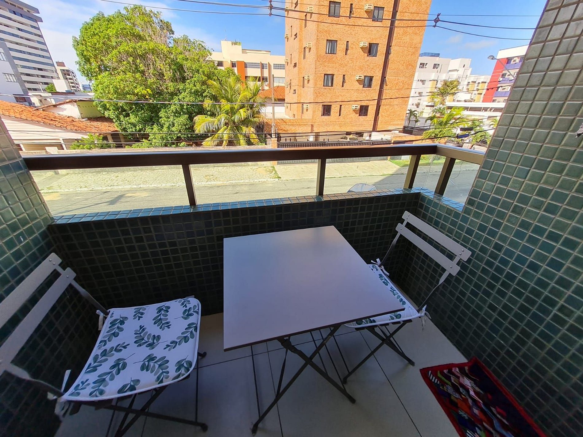 Possui 1 quarto com cama de casal, banheiro social, sala ampla com sofá, varanda com mesa e cadeiras e cozinha completa.