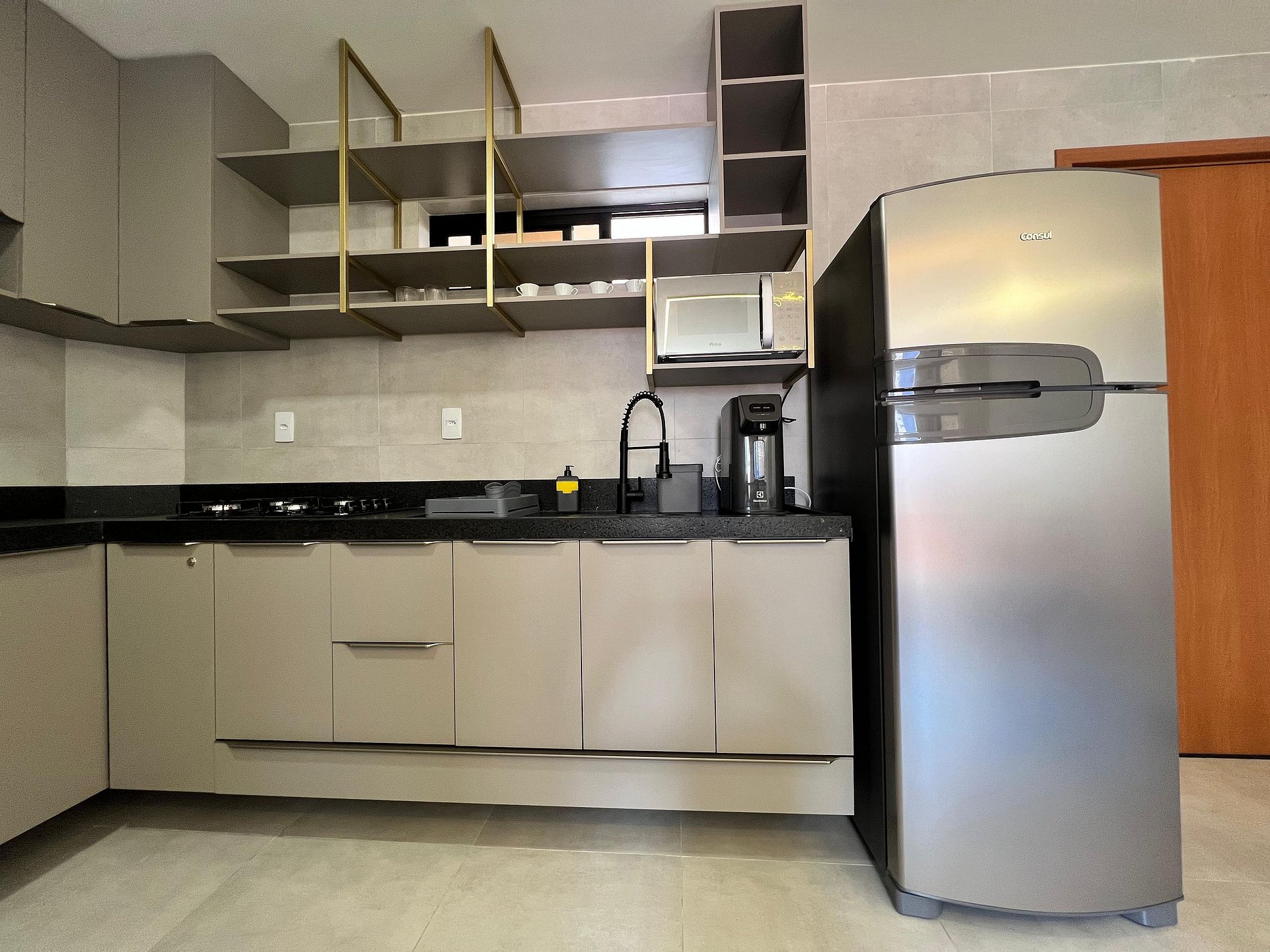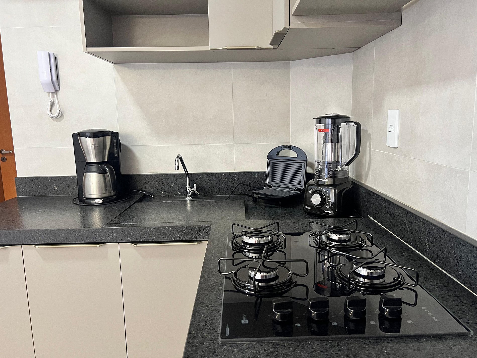 A cozinha compacta é completa — geladeira, fogão, micro-ondas, cafeteira, louças, talheres e utensílios essenciais — tudo pronto para quem gosta de preparar suas próprias refeições.