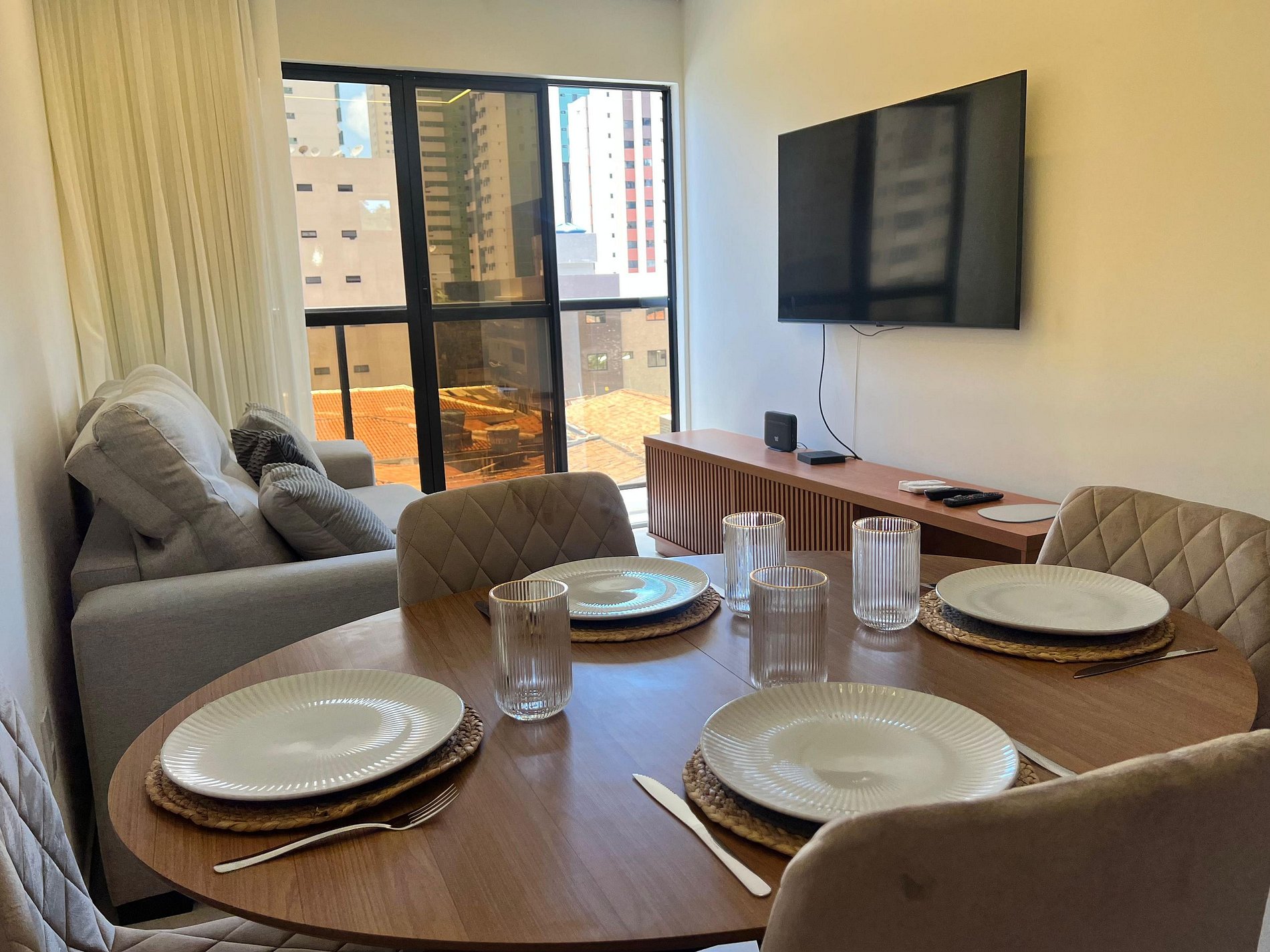 Apartamento completo e aconchegante com dois quartos, ambos com cama de casal. Totalmente climatizado, conta com ar-condicionado, Wi-Fi, sala de estar com mesa, cadeiras e sofá confortável. A cozinha compacta possui utensílios essenciais para o dia a dia, e a varanda oferece uma vista tranquila para a rua. Localizado em Manaíra, conta com garagem fixa, elevadores e uma agradável piscina no térreo. Não possui portaria física, precisa buscar Tag em outro endereço (passado no check-in).