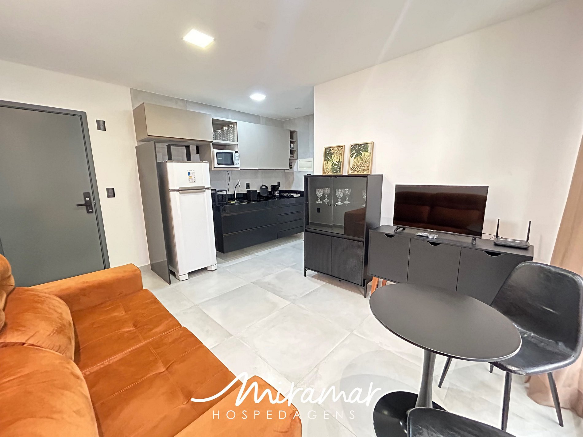 Este confortável apartamento oferece um ambiente perfeito para relaxar e se sentir em casa. A sala, com sua iluminação suave e um sofá acolhedor, convida ao descanso. Uma mesa com duas cadeiras está disponível para suas refeições, e a grande janela proporciona uma vista panorâmica dos prédios da cidade, permitindo que você aproveite a luz natural ao longo do dia. A cozinha americana, compacta e funcional, é equipada com os eletrodomésticos essenciais: fogão, micro-ondas, sanduicheira, cafeteira e geladeira – tudo que você precisa para preparar um delicioso café da manhã ou almoço. O quarto, climatizado com ar-condicionado, conta com uma cama de casal, TV e um guarda-roupas espaçoso para organizar seus pertences, garantindo conforto e praticidade durante sua estadia.