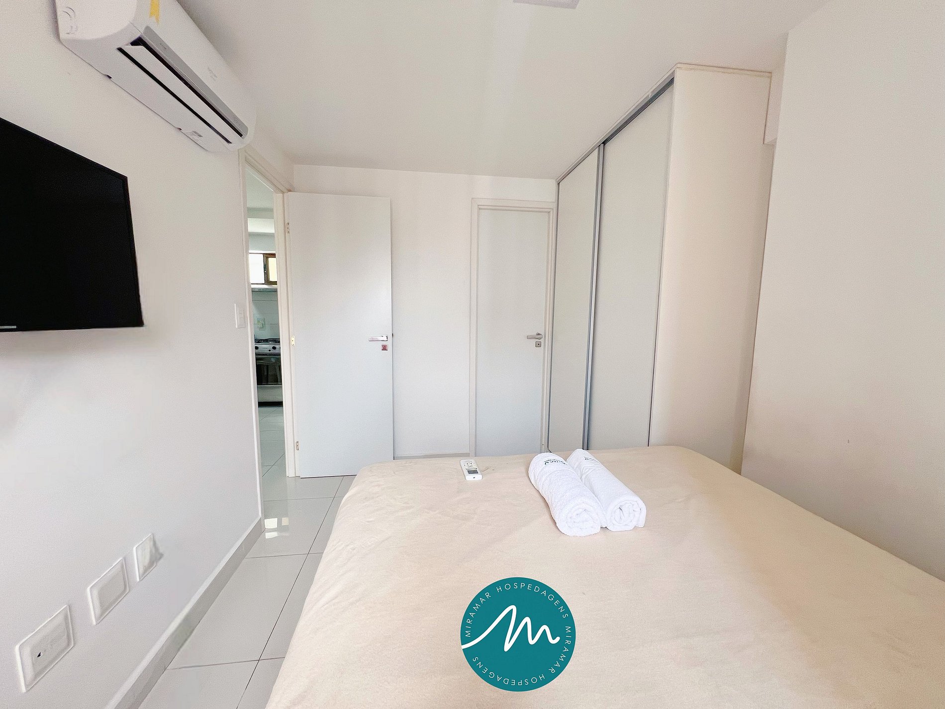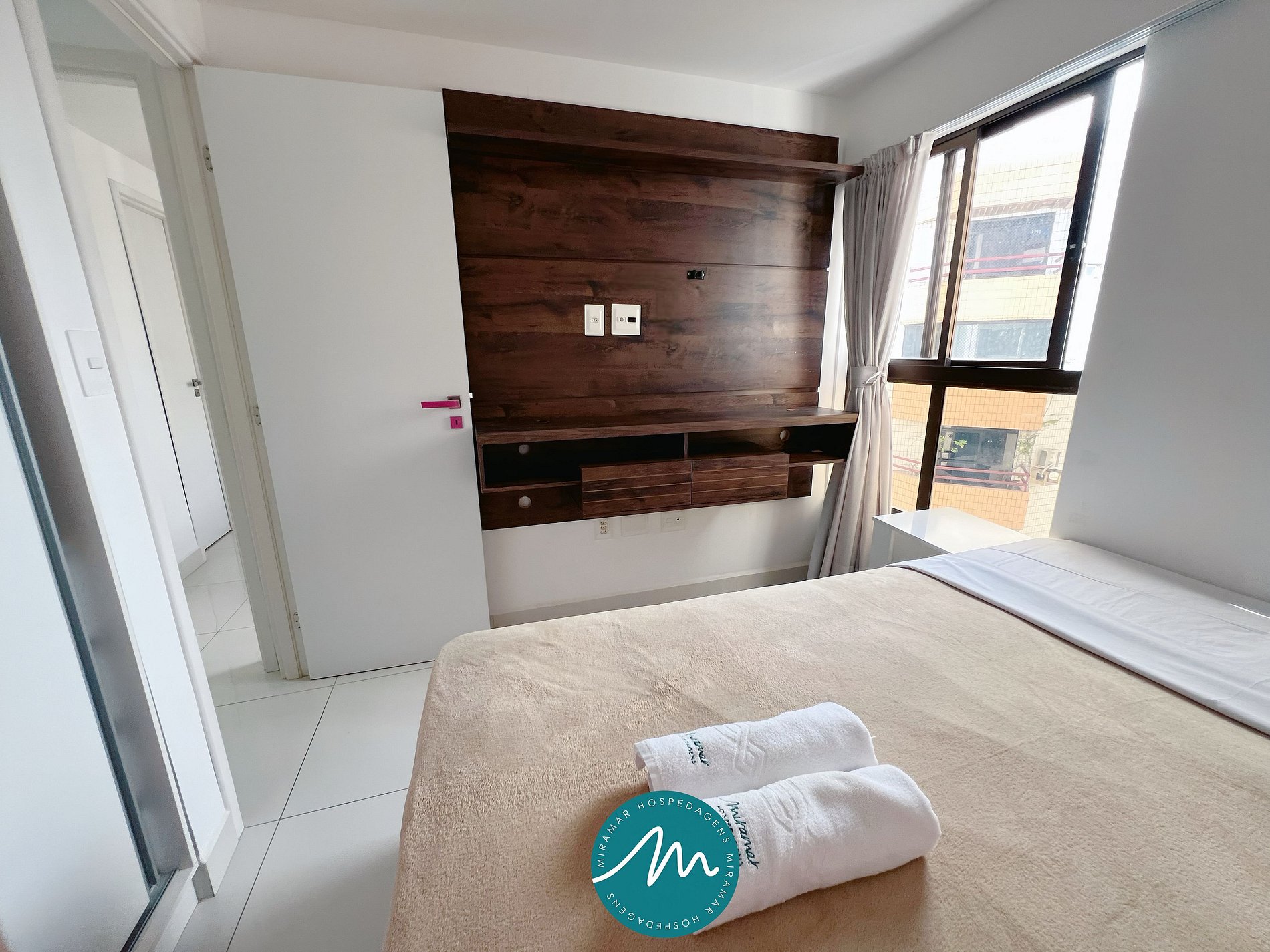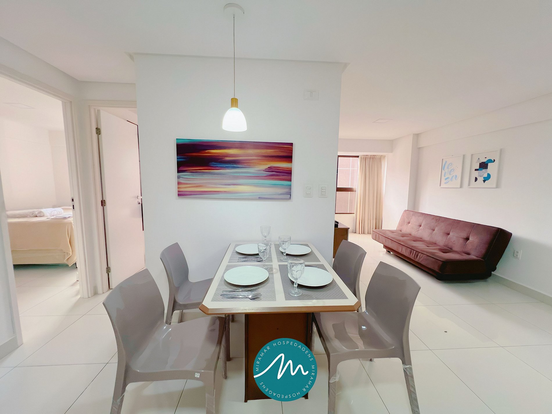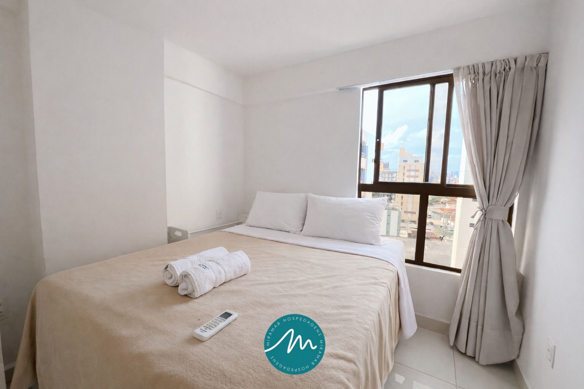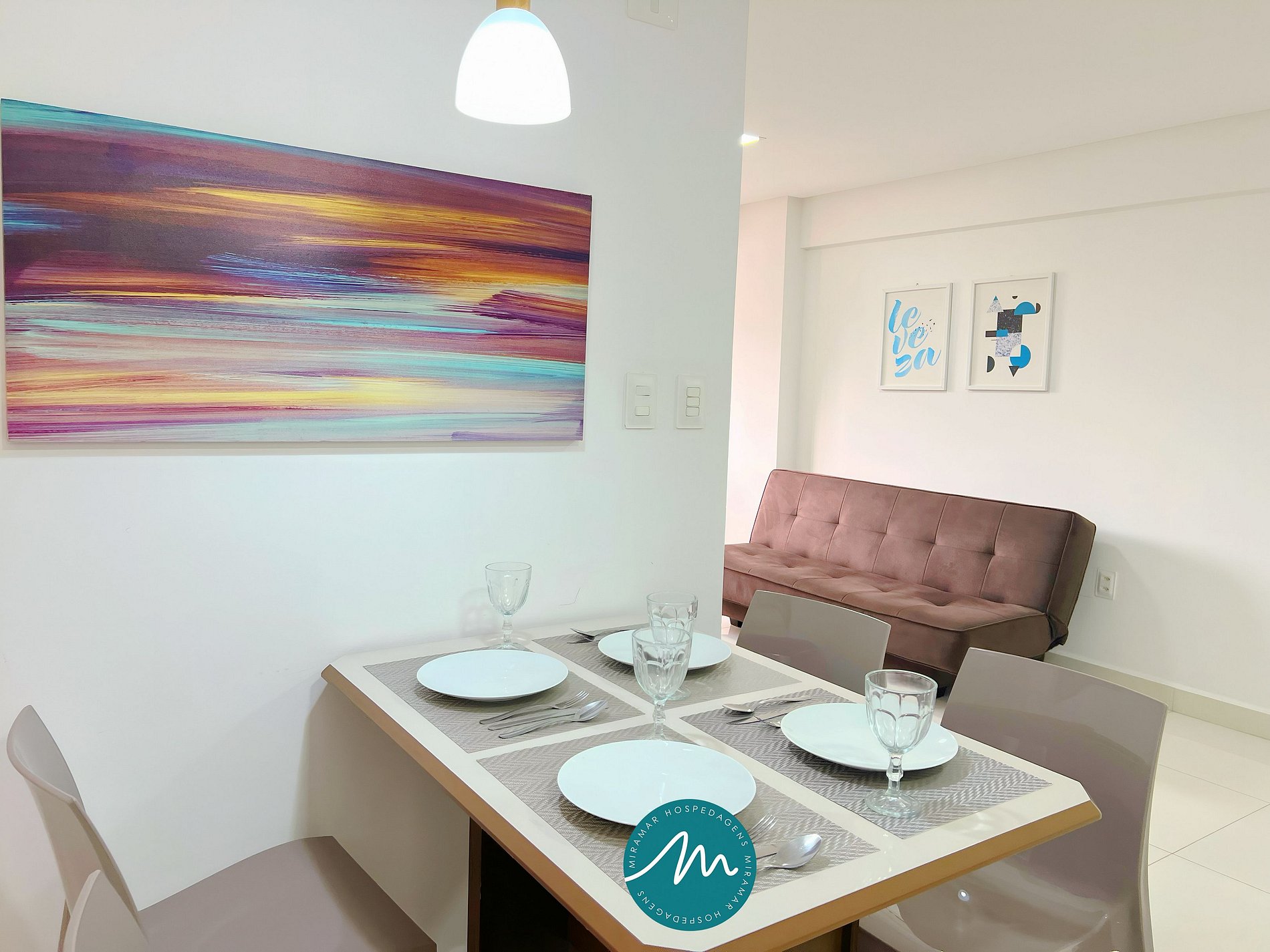Aconchegante apartamento de 2 quartos, ambos com cama de casal e ar-condicionado, sendo um deles suíte. Pode ser ideal para famílias pequenas ou grupos de amigos. A cozinha é funcional e equipada com os eletrodomésticos básicos para o preparo de refeições rápidas. O banheiro com água quente disponível para um banho agradável após aproveitar das áreas comuns do prédio.