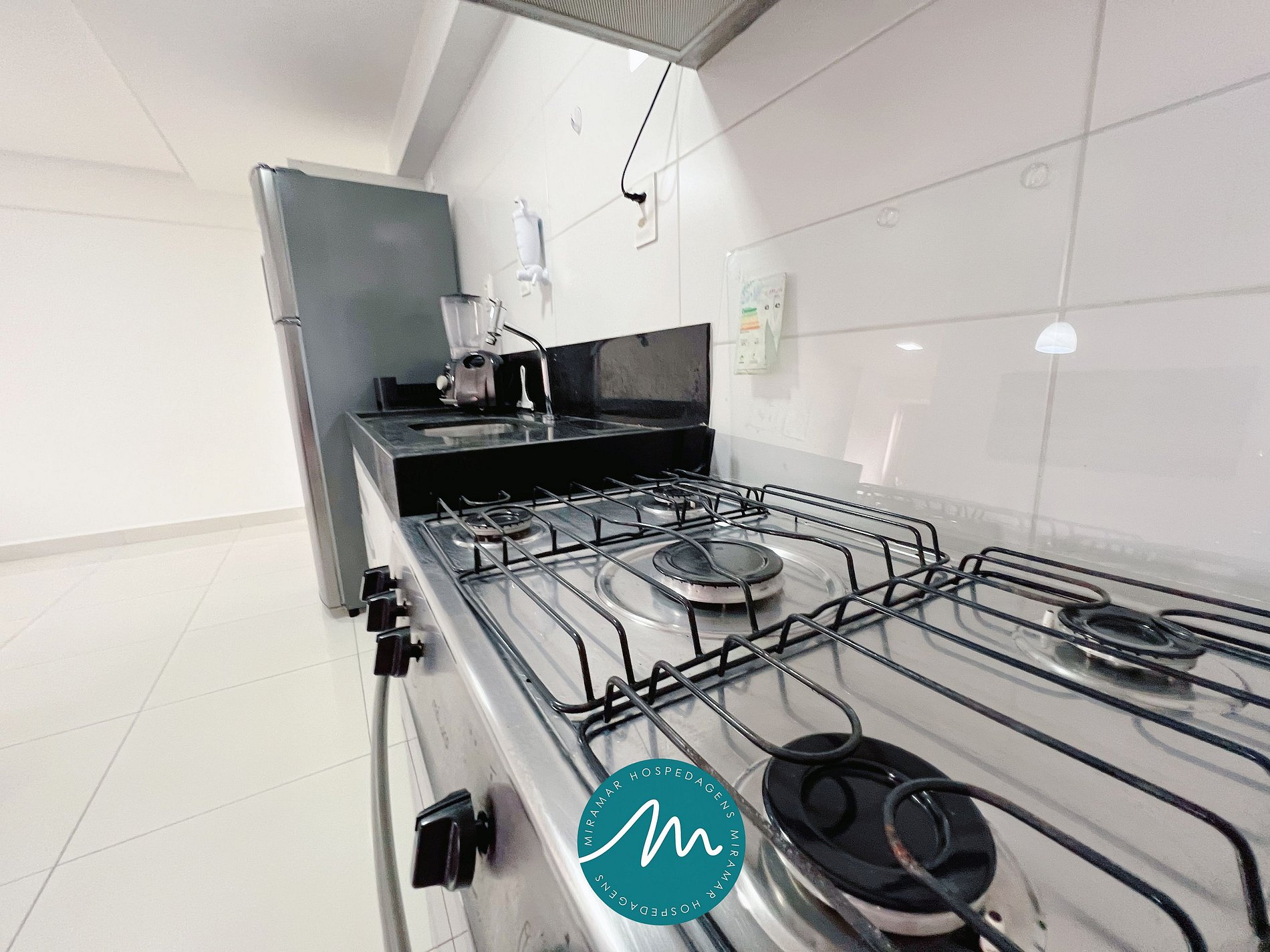 -Cozinha americana equipada com geladeira, fogão, micro-ondas, louças e talheres – tudo o que você precisa para preparar suas refeições com praticidade.