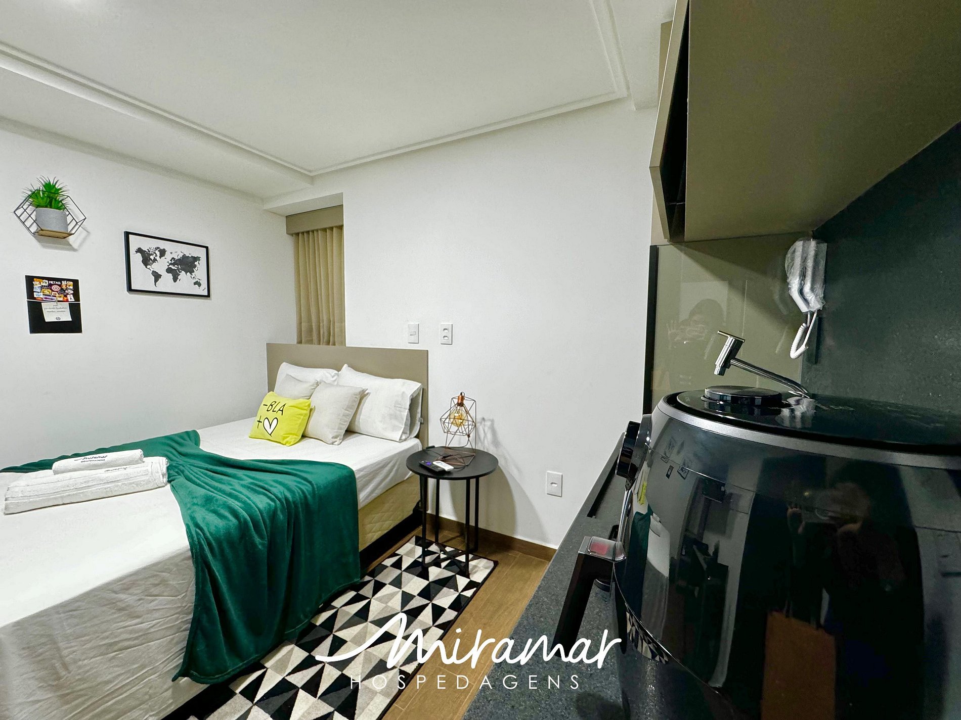 Na cozinha compacta, você encontrará todos os eletrodomésticos necessários para preparar refeições práticas, cafeteira, sanduicheira, frigobar e air fryer.