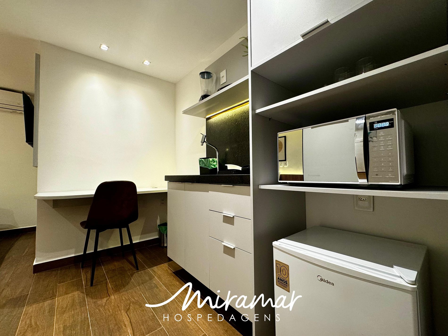 Na cozinha compacta, você encontrará todos os eletrodomésticos necessários para preparar refeições práticas, como frigobar, micro-ondas, sanduicheira e liquidificador.