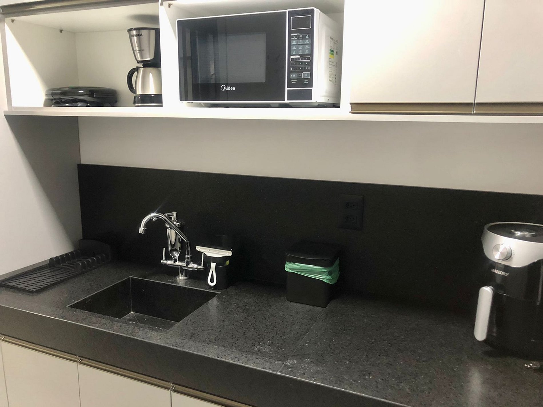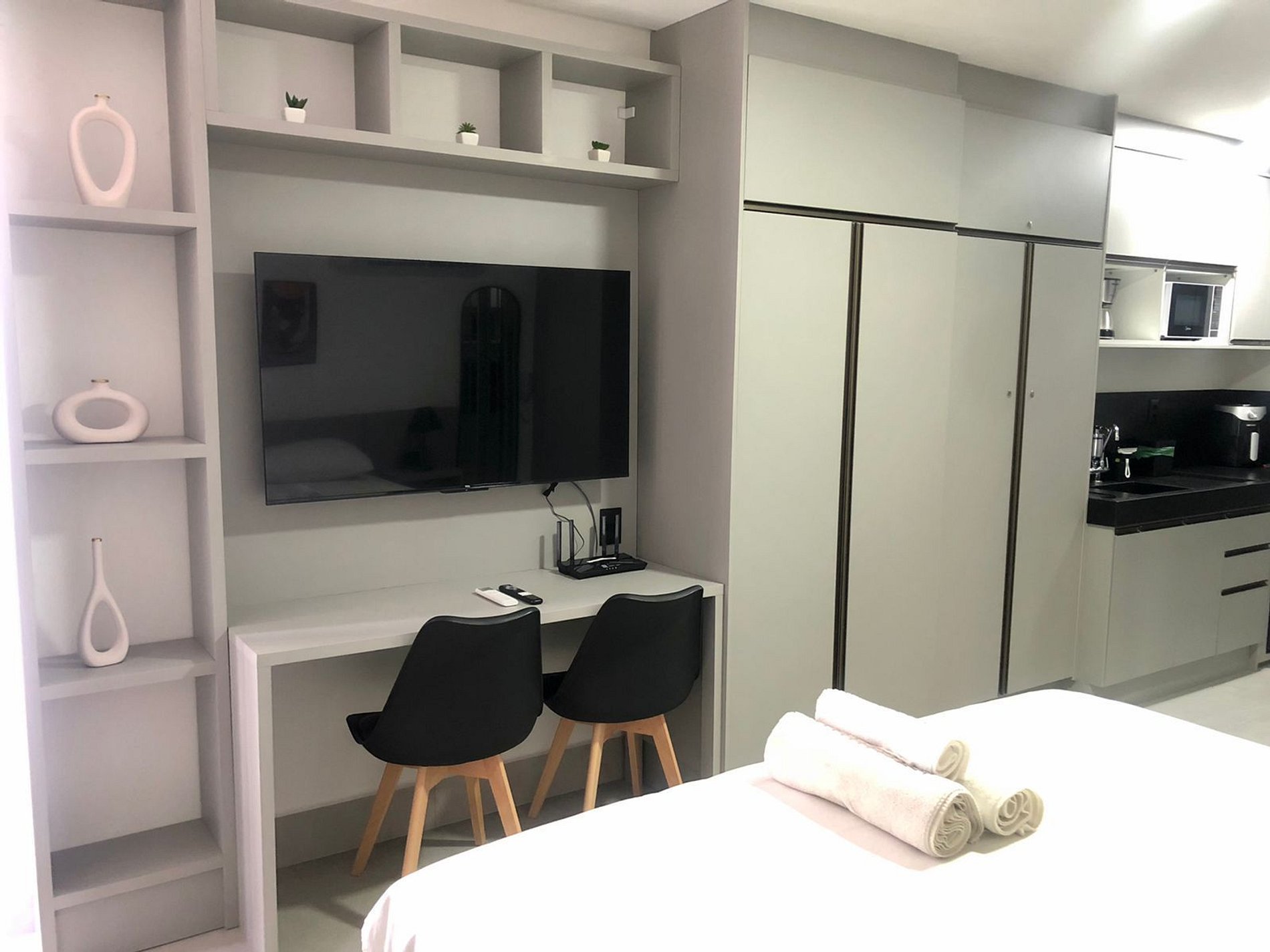 A cozinha está equipada com eletrodomésticos modernos, como frigobar, sanduicheira e micro-ondas, facilitando a preparação de refeições práticas. Adicionalmente, oferecemos enxoval de cama e banho, incluindo lençóis e toalhas.