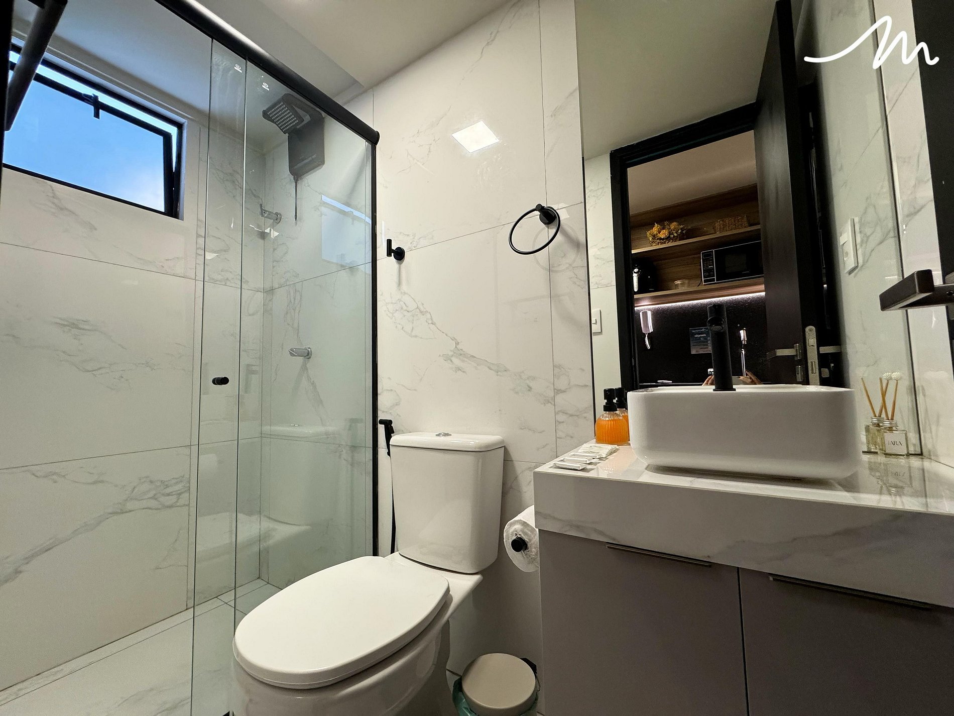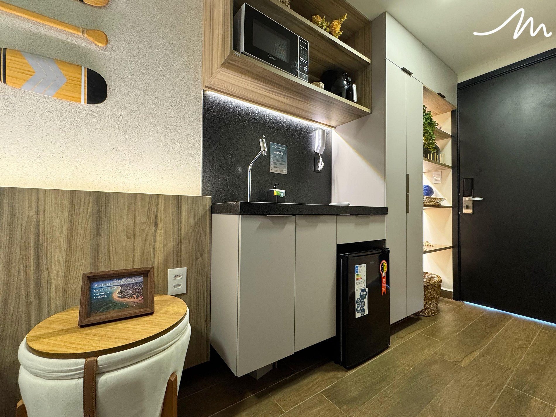 Na cozinha compacta, você encontrará todos os eletrodomésticos necessários para preparar refeições práticas, como cafeteira, micro-ondas, sanduicheira, air fryer e frigobar. Para seu conforto, a unidade também dispõe de ferro de passar roupas e secador de cabelo.