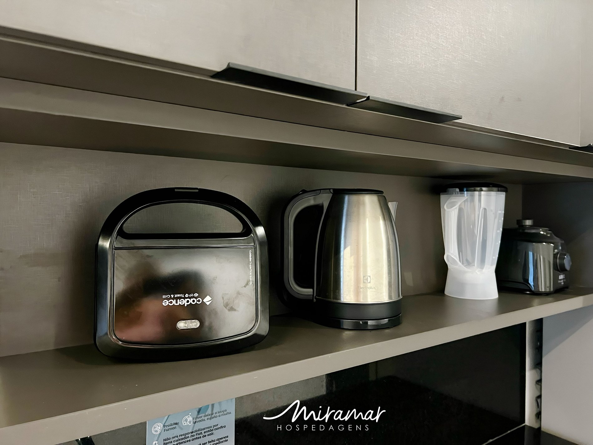 A cozinha, embora compacta, é bem equipada com micro-ondas, chaleira elétrica, sanduicheira, geladeira e liquidificador. Os talheres – como colheres, garfos e facas – são disponibilizados de acordo com o número de hóspedes, oferecendo praticidade nas refeições.