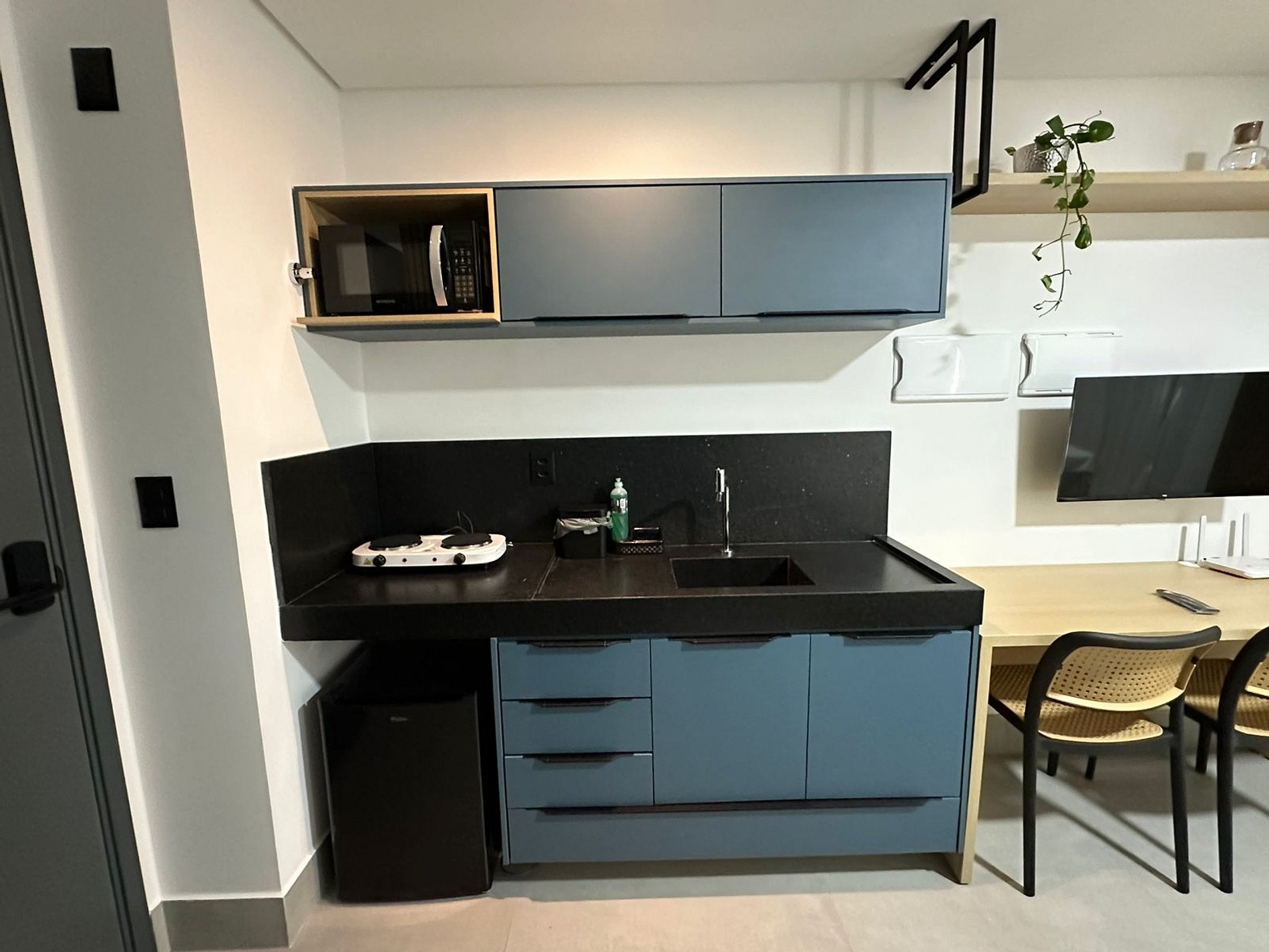 O apartamento conta com uma cama de casal aconchegante, garantindo noites de sono revigorantes. Para seu entretenimento, há uma Smart TV e acesso Wi-Fi, perfeitos para momentos de lazer. A cozinha moderna é um grande diferencial, equipada com frigobar, fogão e micro-ondas, facilitando a preparação de refeições rápidas e práticas, ducha com água quente e sanitário separado para maior praticidade.