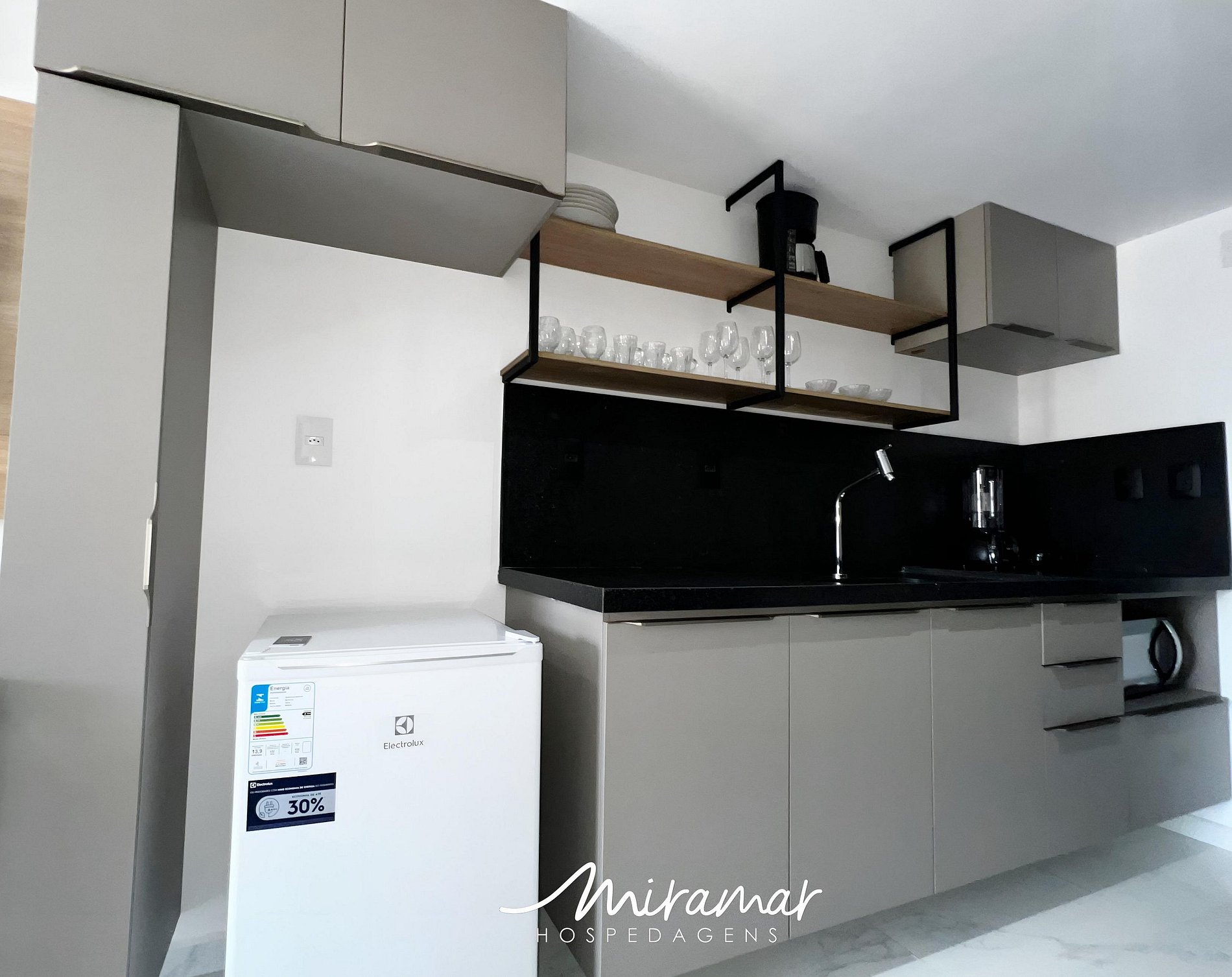 A cozinha inclui frigobar, micro-ondas, cafeteira e sanduicheira.