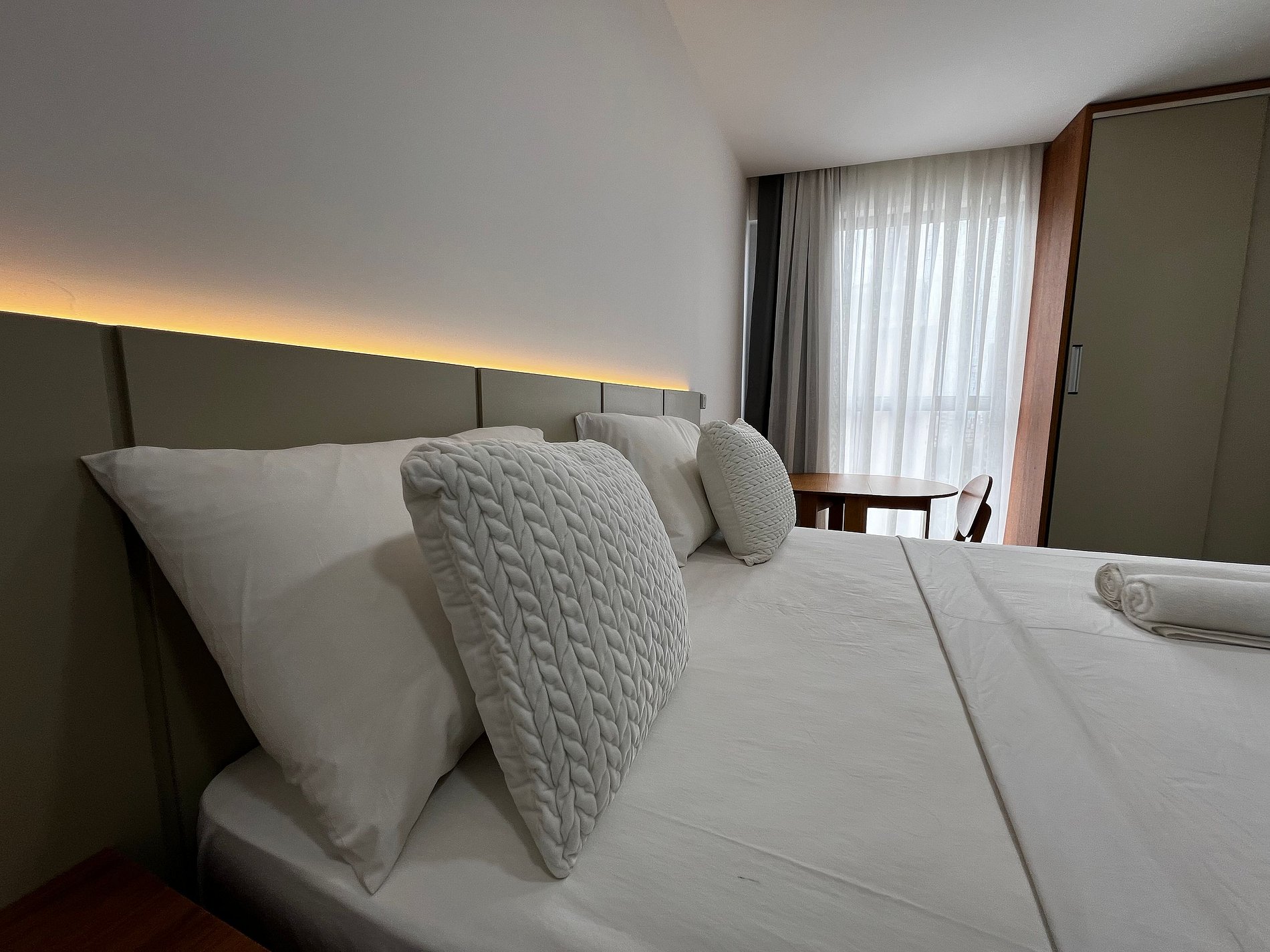 A cozinha compacta é um verdadeiro destaque, equipada com utensílios essenciais como frigobar, cooktop, micro-ondas, sanduicheira, liquidificador, airfryer e cafeteira, permitindo preparar refeições rápidas e deliciosas. O ambiente também inclui mesa e cadeiras e enxoval de cama e banho, para seu conforto.