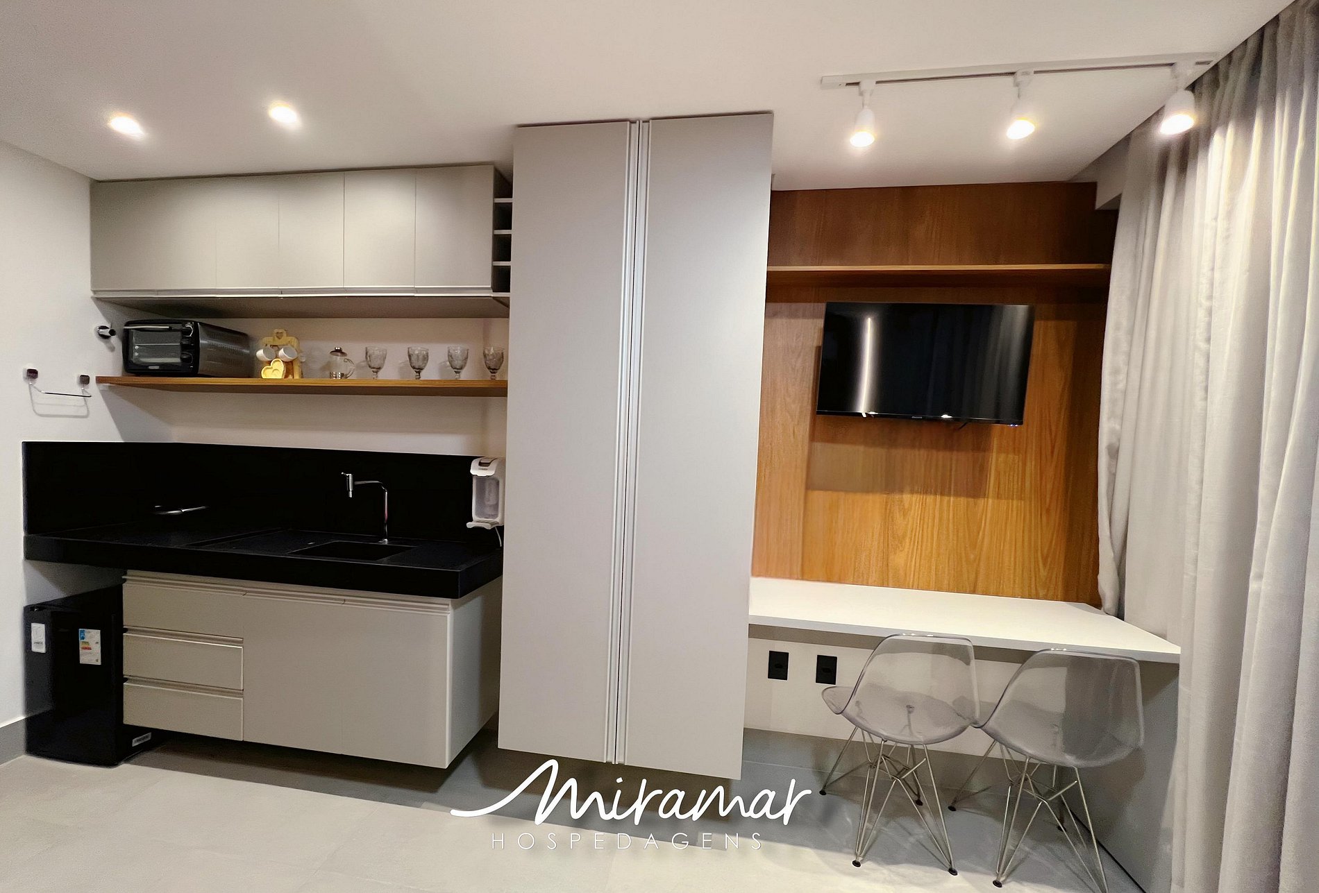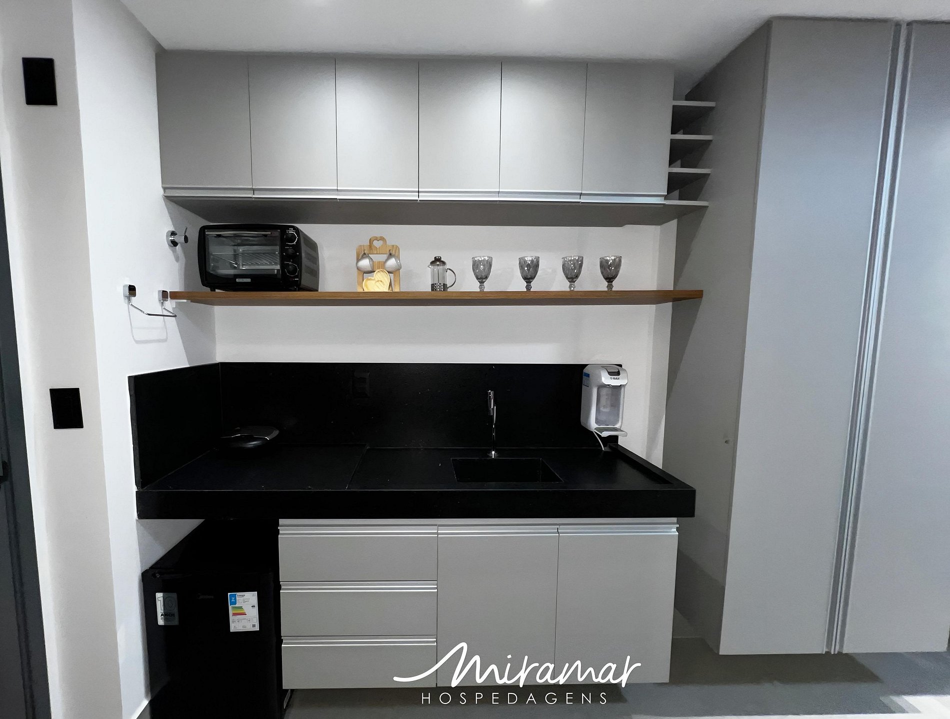 A cozinha, moderna e equipada, possui eletrodomésticos como frigobar, cafeteira prensa francesa, sanduicheira, forno eletrico e um purificador de agua, facilitando o preparo de refeições rápidas e práticas. Oferece também um enxoval de cama e banho com lençóis e toalhas, para que sua estadia seja ainda mais confortável e agradável. É o espaço perfeito para relaxar e se sentir em casa!