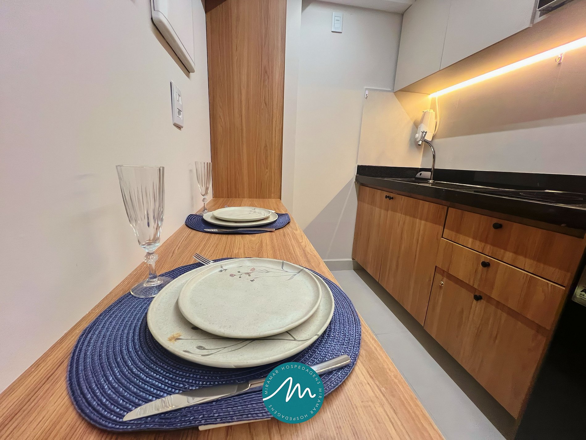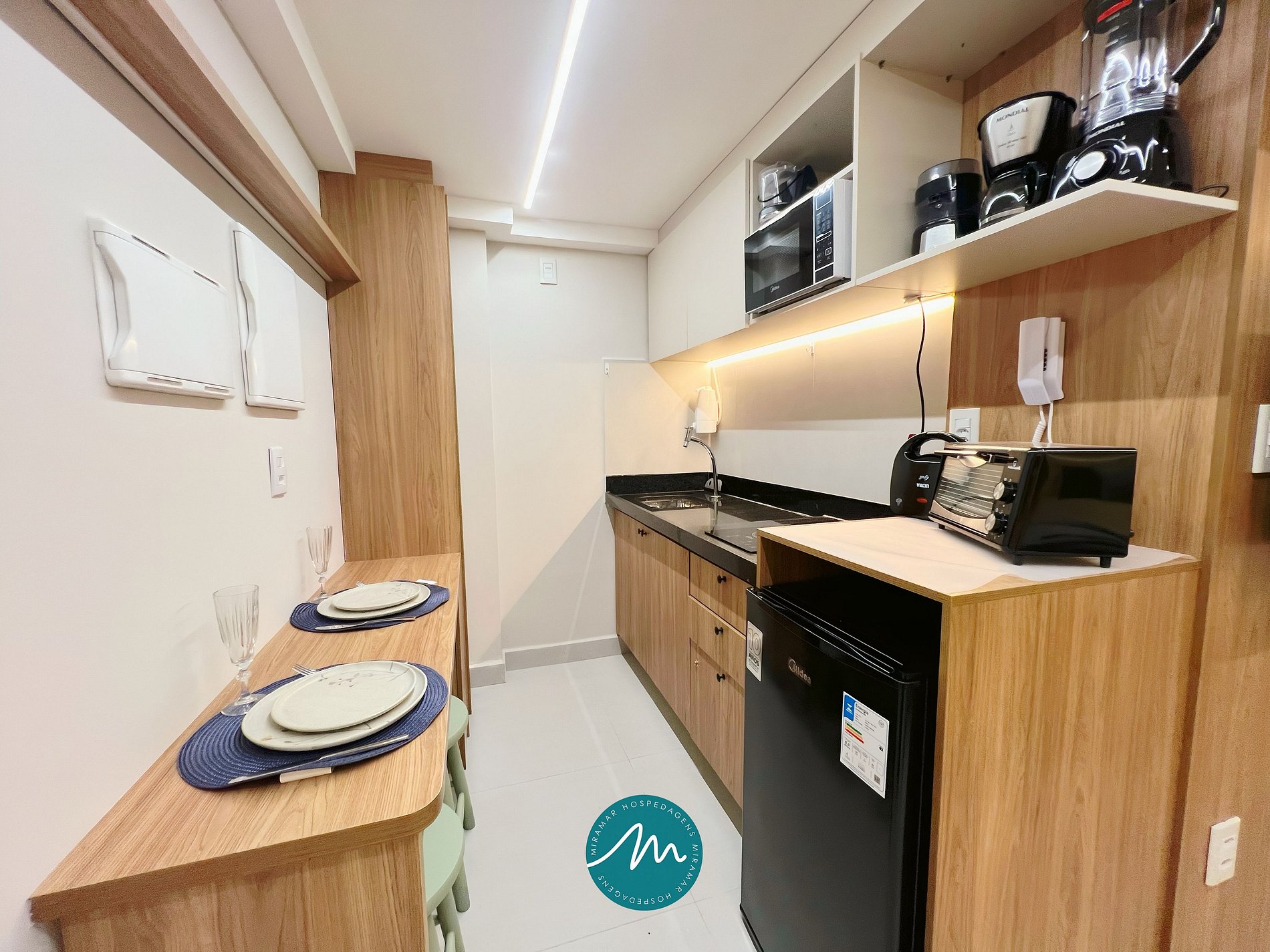 O ambiente dispõe de arara com cabides para organização dos pertences, bancada que pode ser utilizada como espaço de trabalho e televisão para seus momentos de descanso e entretenimento. A cozinha, embora compacta, é completa e funcional, equipada com fogão de indução, cafeteira, sanduicheira, micro-ondas, frigobar e forno elétrico, louças e talheres, tudo o que você precisa para preparar suas refeições com comodidade.