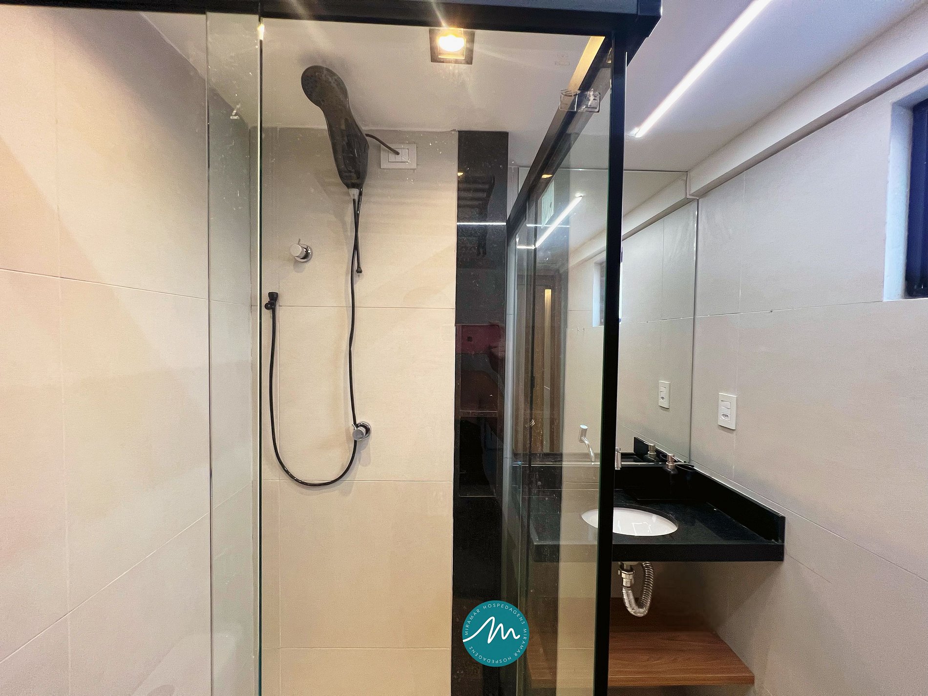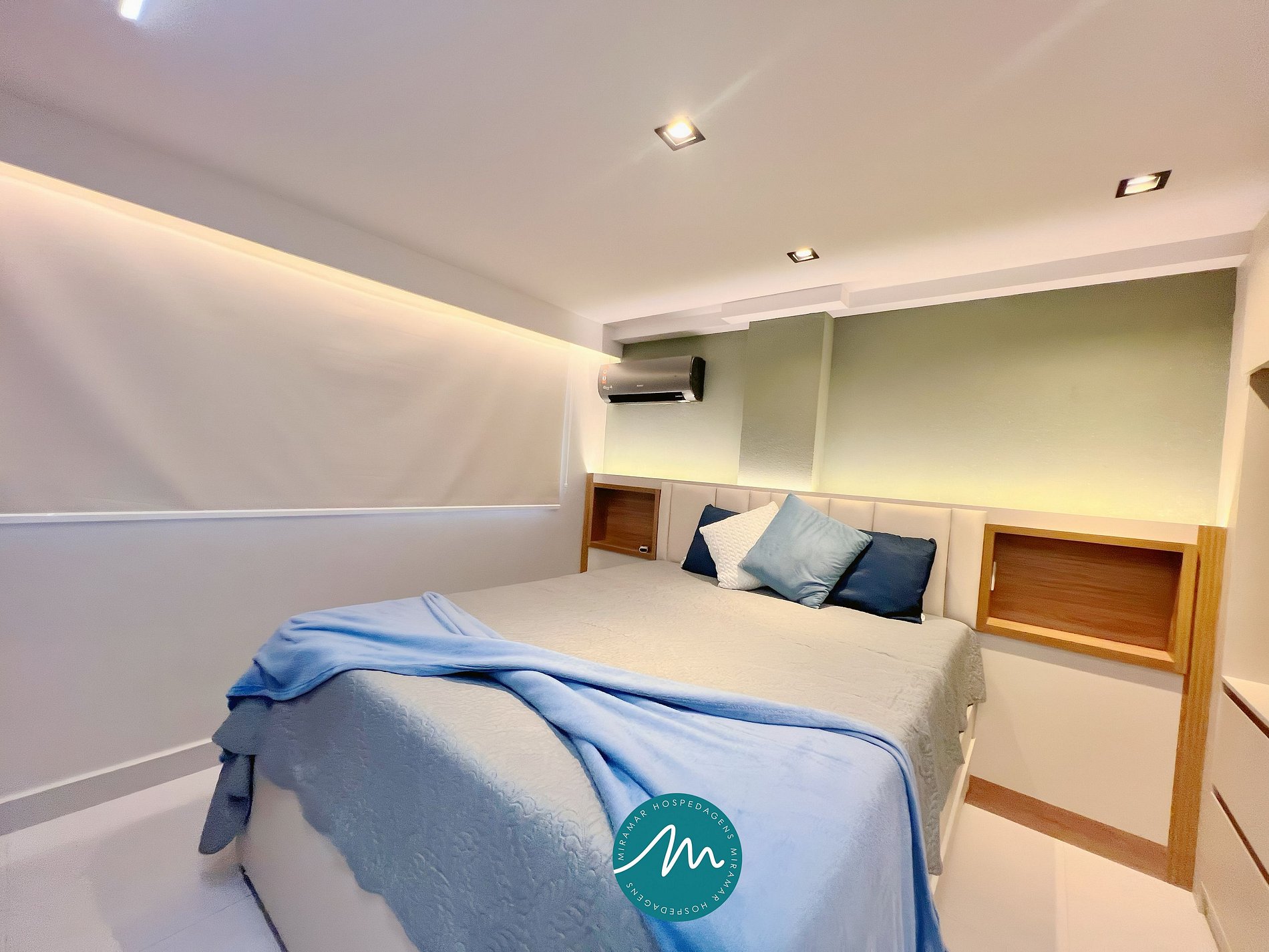 Para noites tranquilas, o flat conta com cortina blackout, garantindo um sono reparador. O banheiro é aconchegante, com espelho amplo e chuveiro com água quente, ideal para relaxar após um dia de praia ou passeios.