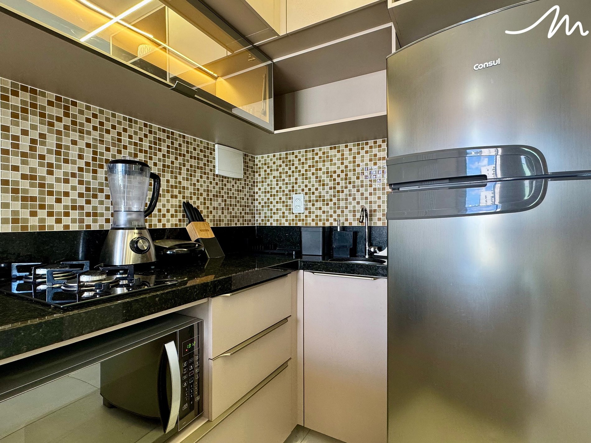 -Cozinha funcional equipada com geladeira, fogão, micro-ondas, cafeteira, liquidificador e sanduicheira – perfeita para preparar refeições práticas durante a estadia
