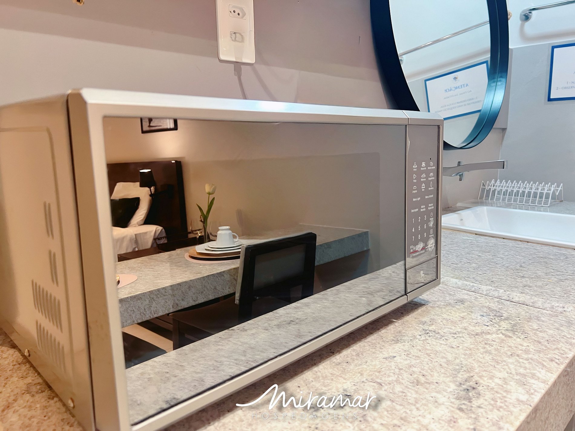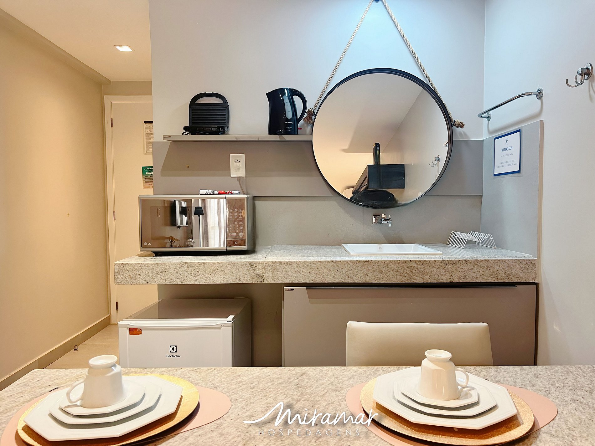 Na área de apoio você encontrará frigobar, micro-ondas, chaleira elétrica, sanduicheira, além de louças e talheres básicos, ideais para preparar lanches rápidos ou um café da manhã prático.